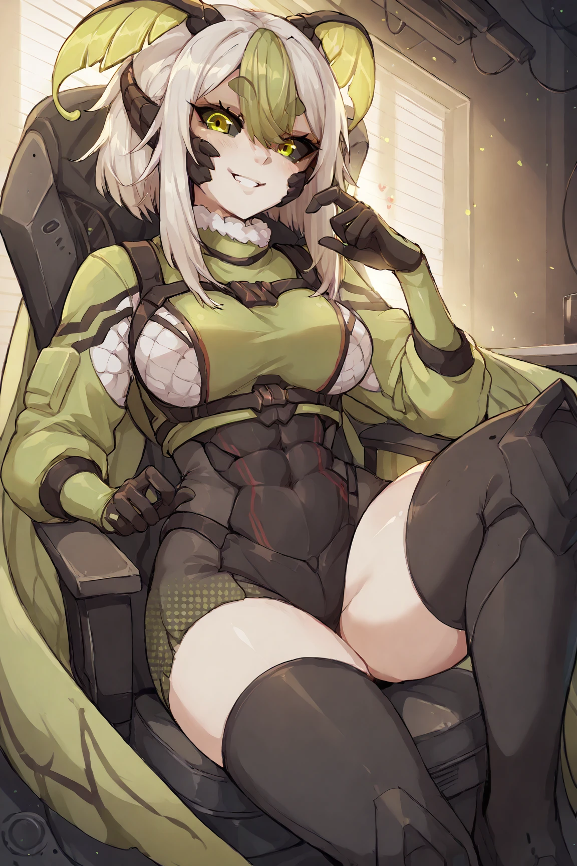 juniperactias and lunesuit are the main triggers for the character and outfit respectively, but I suggest helping it along by adding pale skin, black sclera, (green eyes:0.8) and [black thighhighs, black gloves::2] (Automatic1111 prompt editing) as necessary.