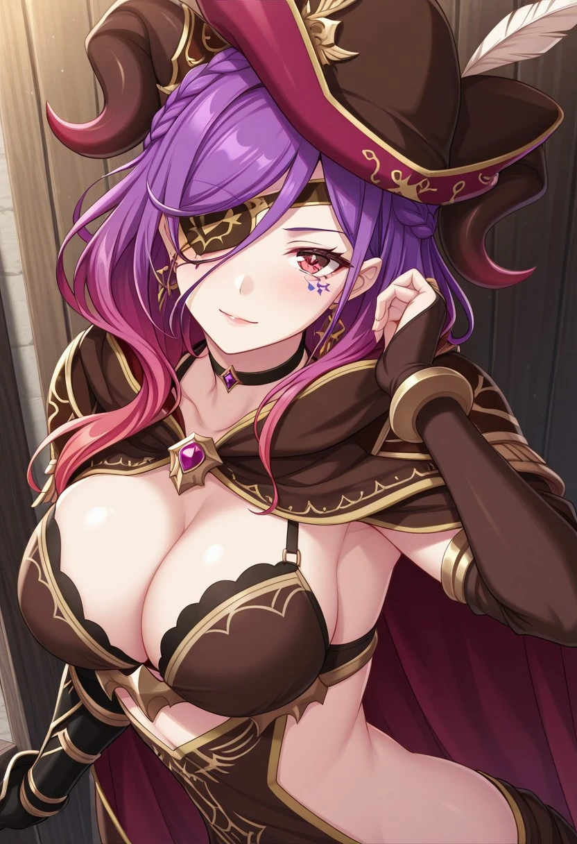 1 girl, RafaelaSankai, purple hair, long hair, braid, multicolored hair, gradient hair, demon horns, red eyes, facial tattoo, facial mark, pirate hat, gold tiara, eyepatch, black choker, cape, rfl cape, brown dress, backless dress, cleavage cutout, clothing cutout, side cutout, side slit, black bra, fingerless gloves, bridal gauntlets, gauntlets,single gauntlet, asymmetrical gloves, armored skirt,showgirl skirt, thigh bootsRafaela - extras