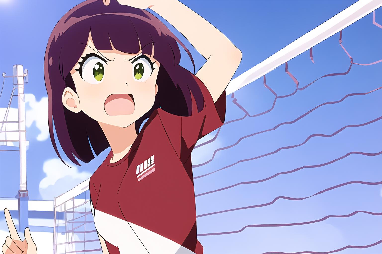 Prompt: best quality, 1woman/1girl, standing, beautifu face, bangs, blunt bangs, brown purple hair, short hair, green eyes, Urusei Yatsura, Shinobu Miyake,
