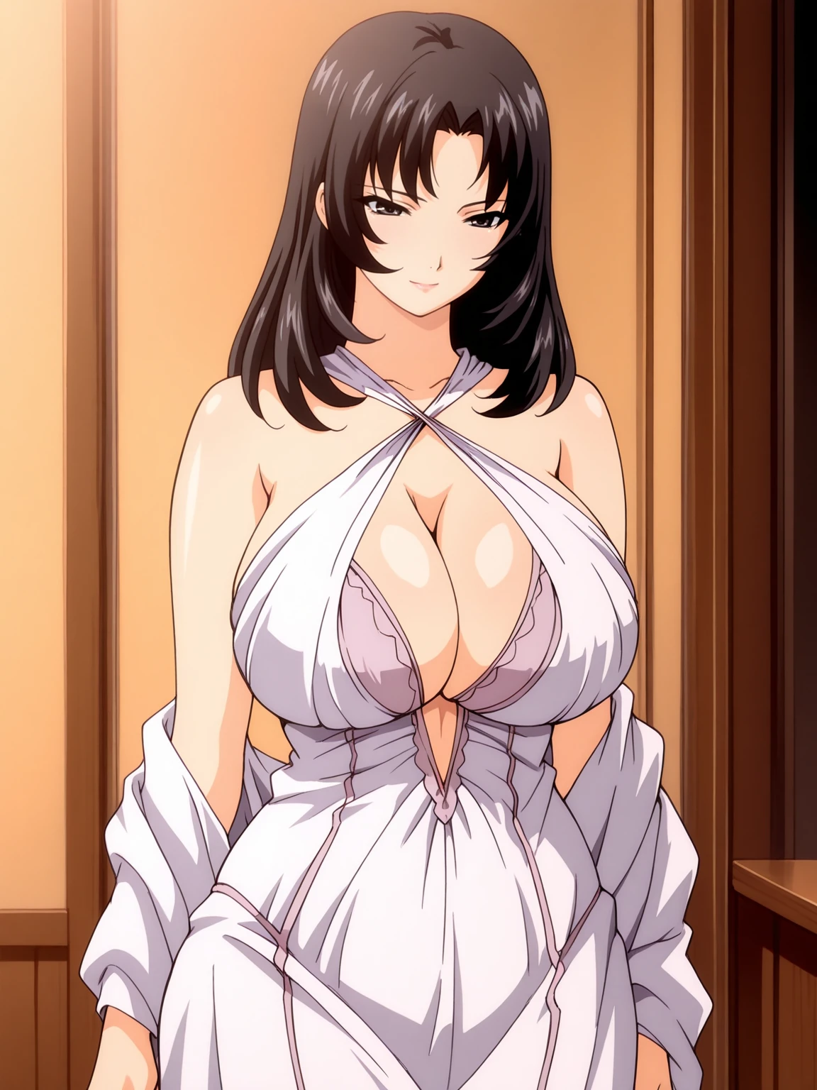 white dress, cleavage, criss-cross halter, halterneck, shawl