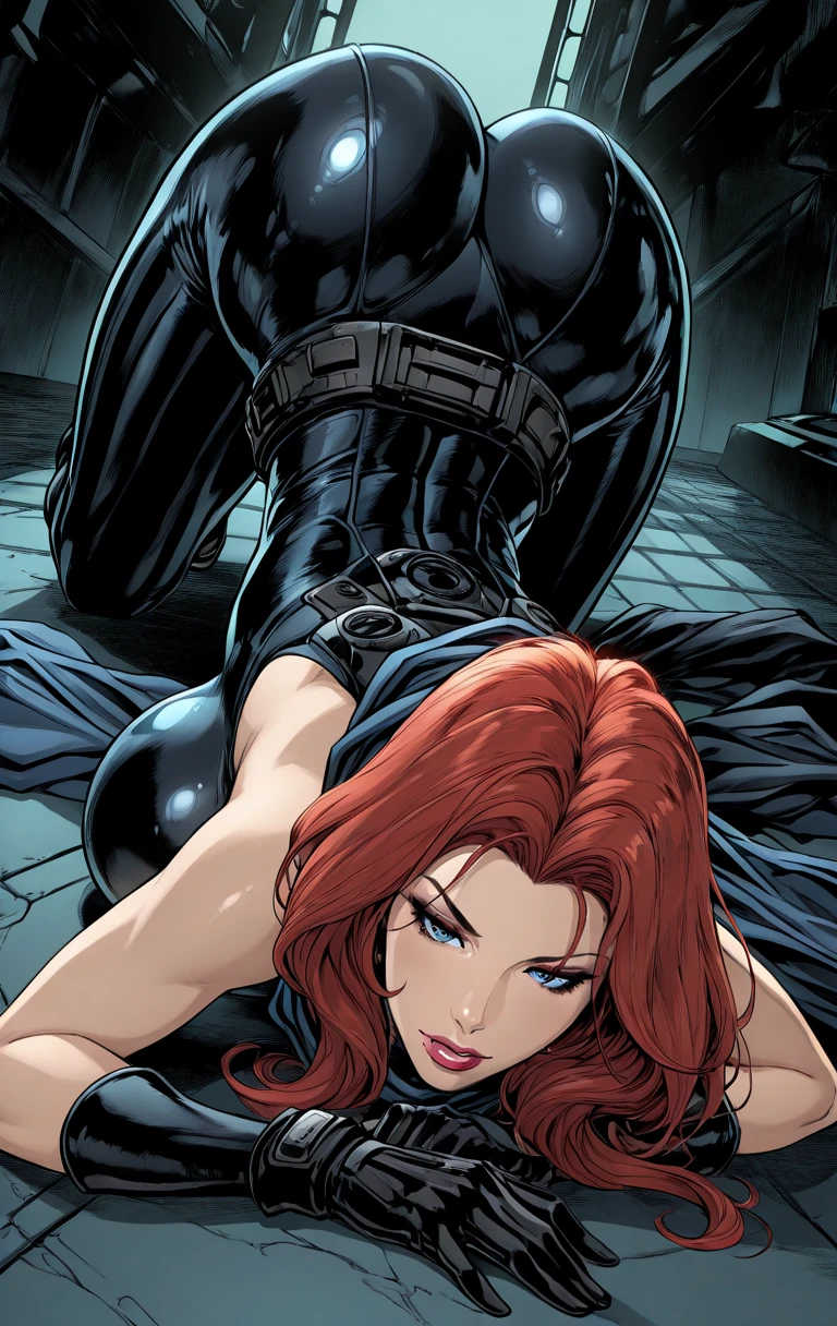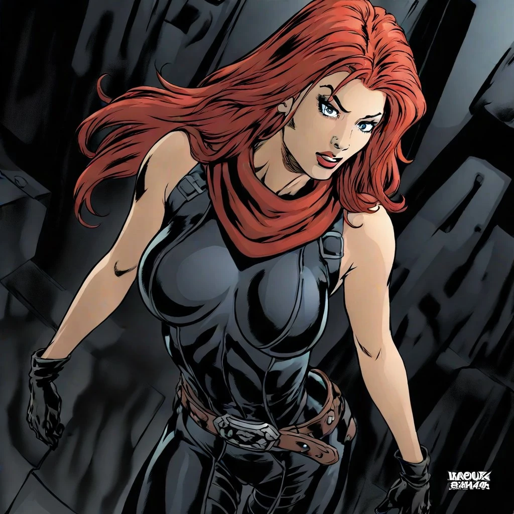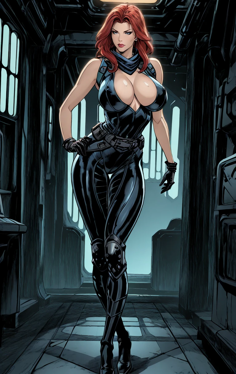 M4r4J4d3, 1girl, gloves, solo, red hair, boots, breasts, belt, long hair, large breasts, green eyes,