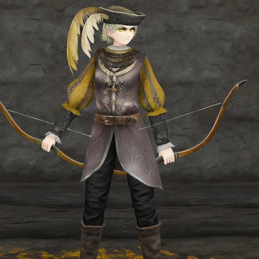 1girl,solo,blonde hair,short hair,hat,hat feather,yellow eyes,necklace,long sleeves,belt,pants,boots,