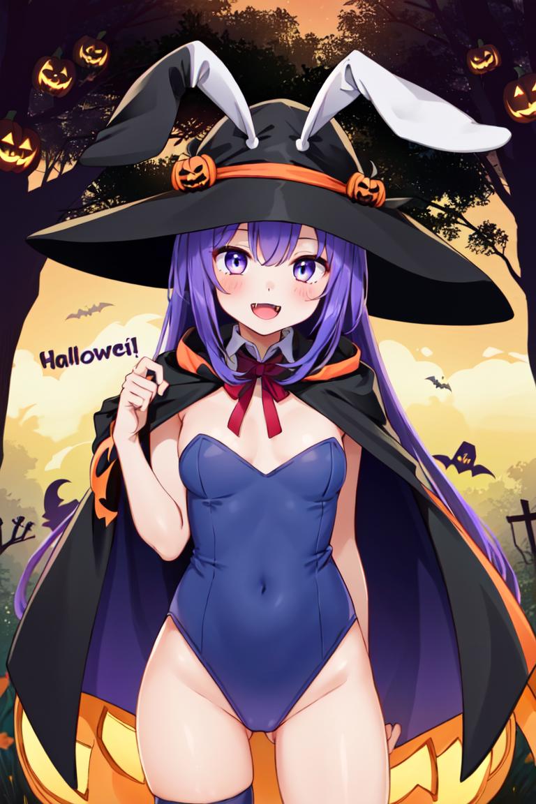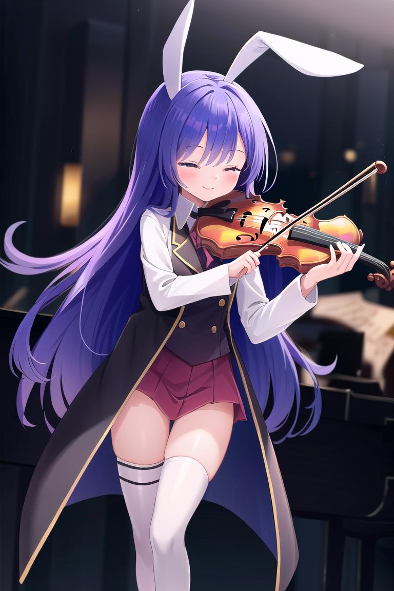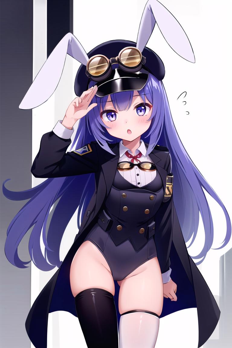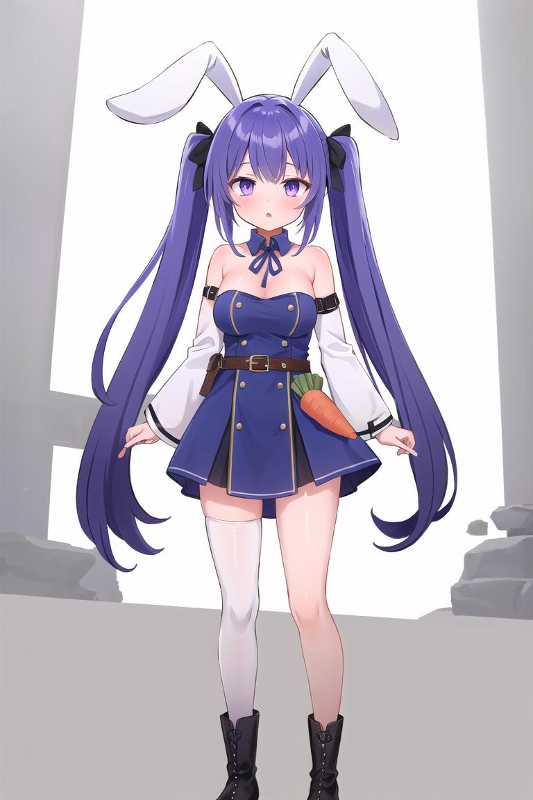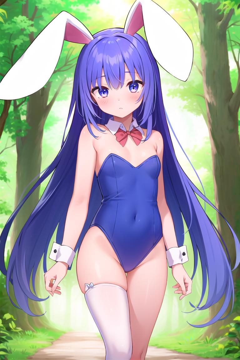 Full prompt is purple eyes, purple hair, rabbit ears, leotard, detached collar, wrist cuffs, bowtie, single thighhigh