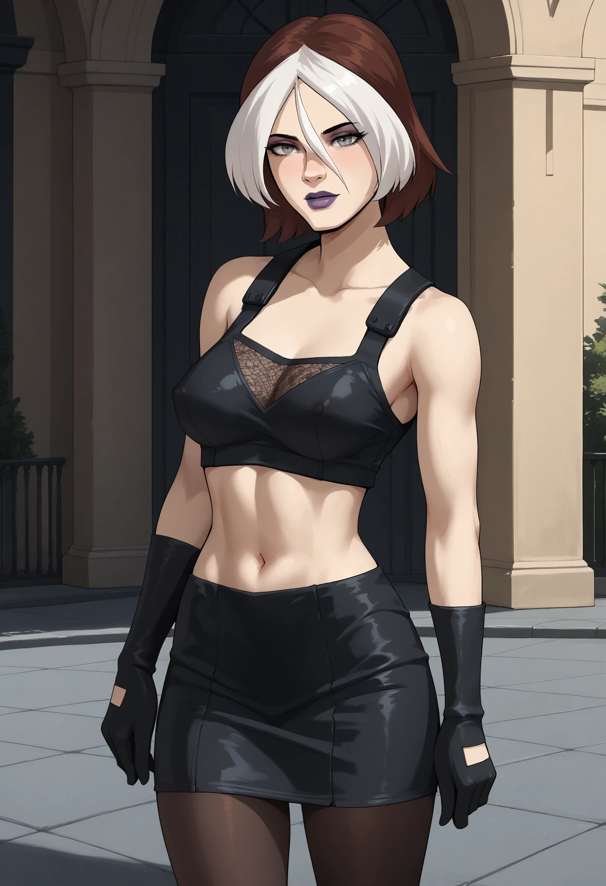 main tags: 1girl, solo, grey eyes, short hair, brown hair, white hair, two-tone hair, multicolored hair, hair between eyes, bangs, lipstick, purple lips, makeup, breasts, medium breasts,