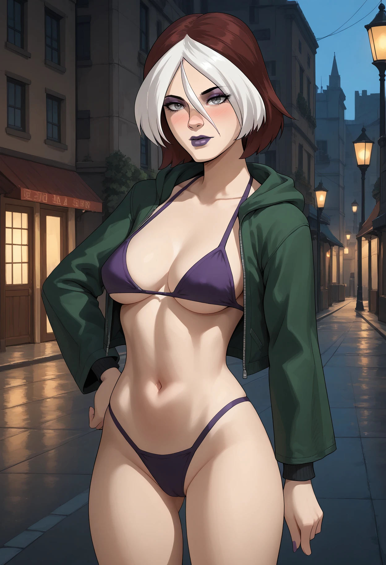1girl, solo, grey eyes, short hair, brown hair, white hair, two-tone hair, multicolored hair, hair between eyes, bangs, lipstick, purple lips, makeup, breasts, medium breasts,