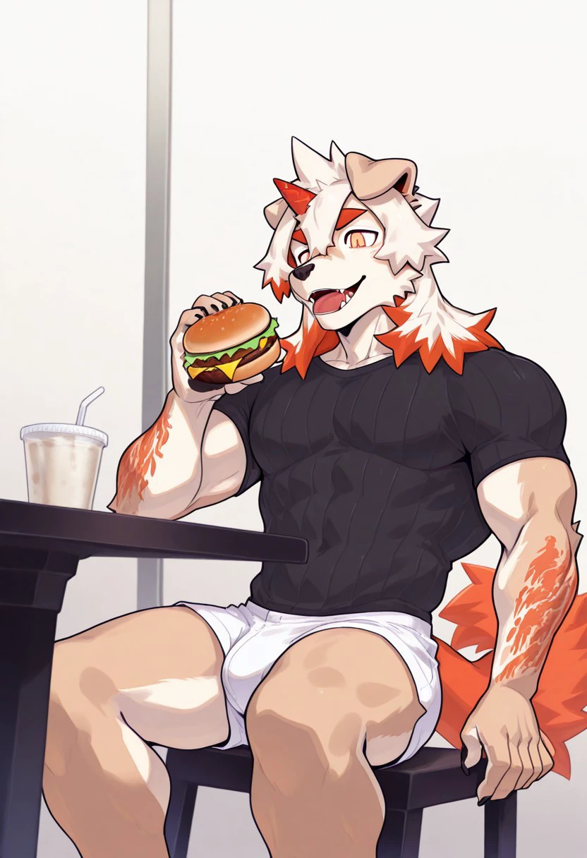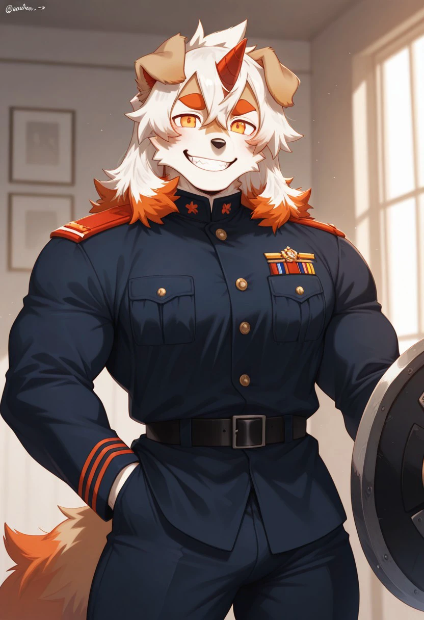 hung, animal ears ,brown fur ,dog ears ,medium hair ,white hair ,orange ombre hair ,orange eyes ,single horn,