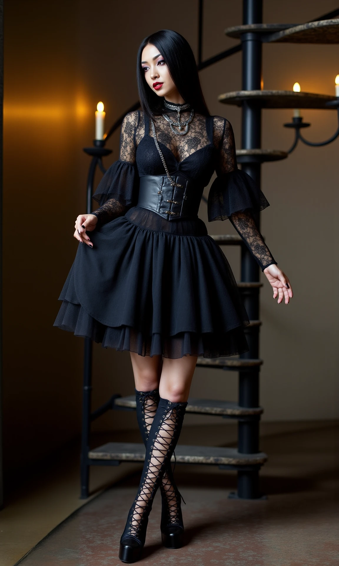 Ever looked for fancy and versatile clothing for your gothic, vampire or metal cuties? Well then, here it is. This LoRA is trained on many different outfits and materials, for example: leather harnesses, mini, midi an long gothic dresses, corsets with chains and straps, bodysuits and tops with extensive cutouts (Adam Saaks style), lingerie with lace and chains, clothing parts in the shape of bat wings, mesh and fishnet tops, leather pants (with and without cutouts), lace and tulle skirts, strappy dresses with cutouts, black boots in different styles.
