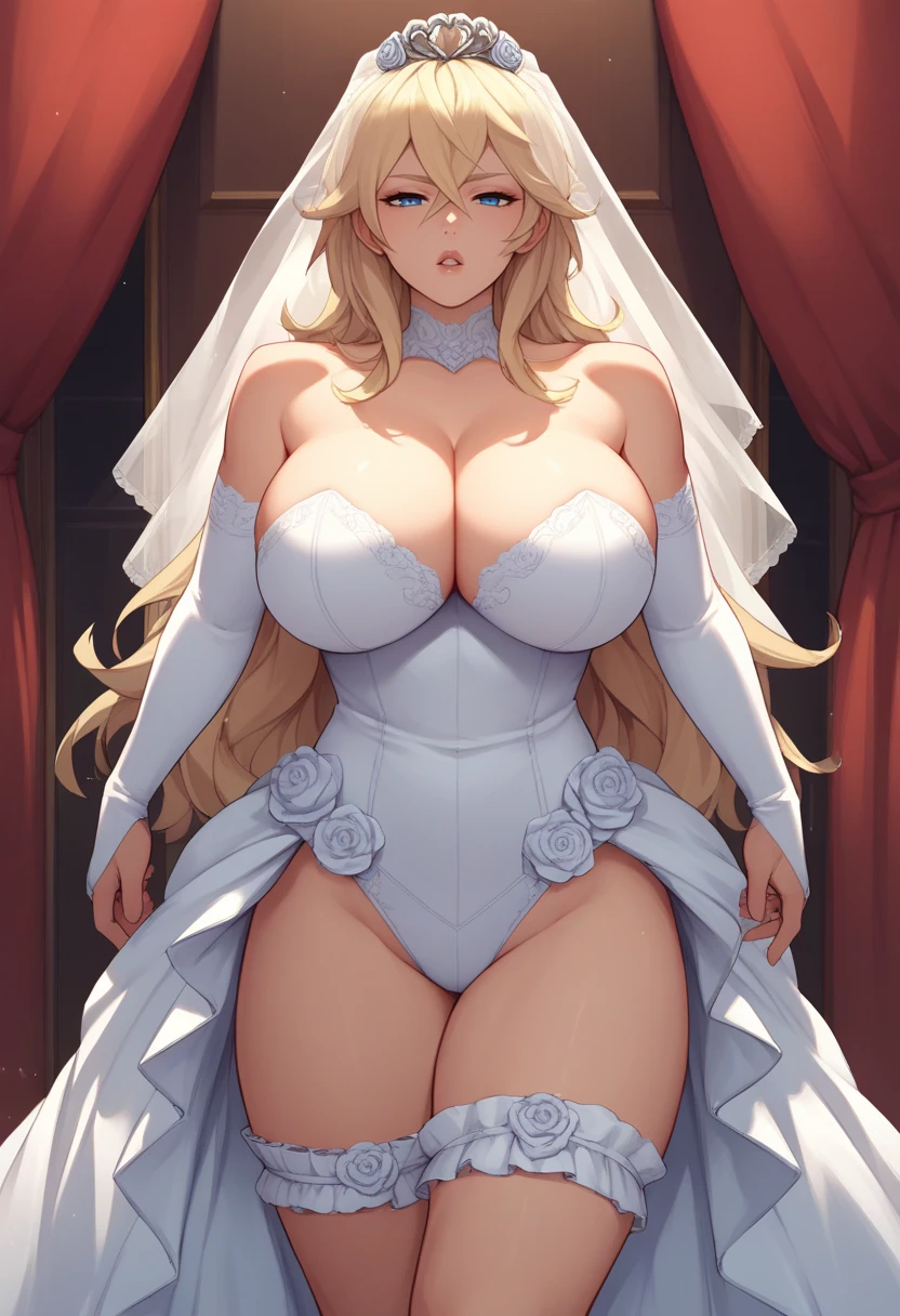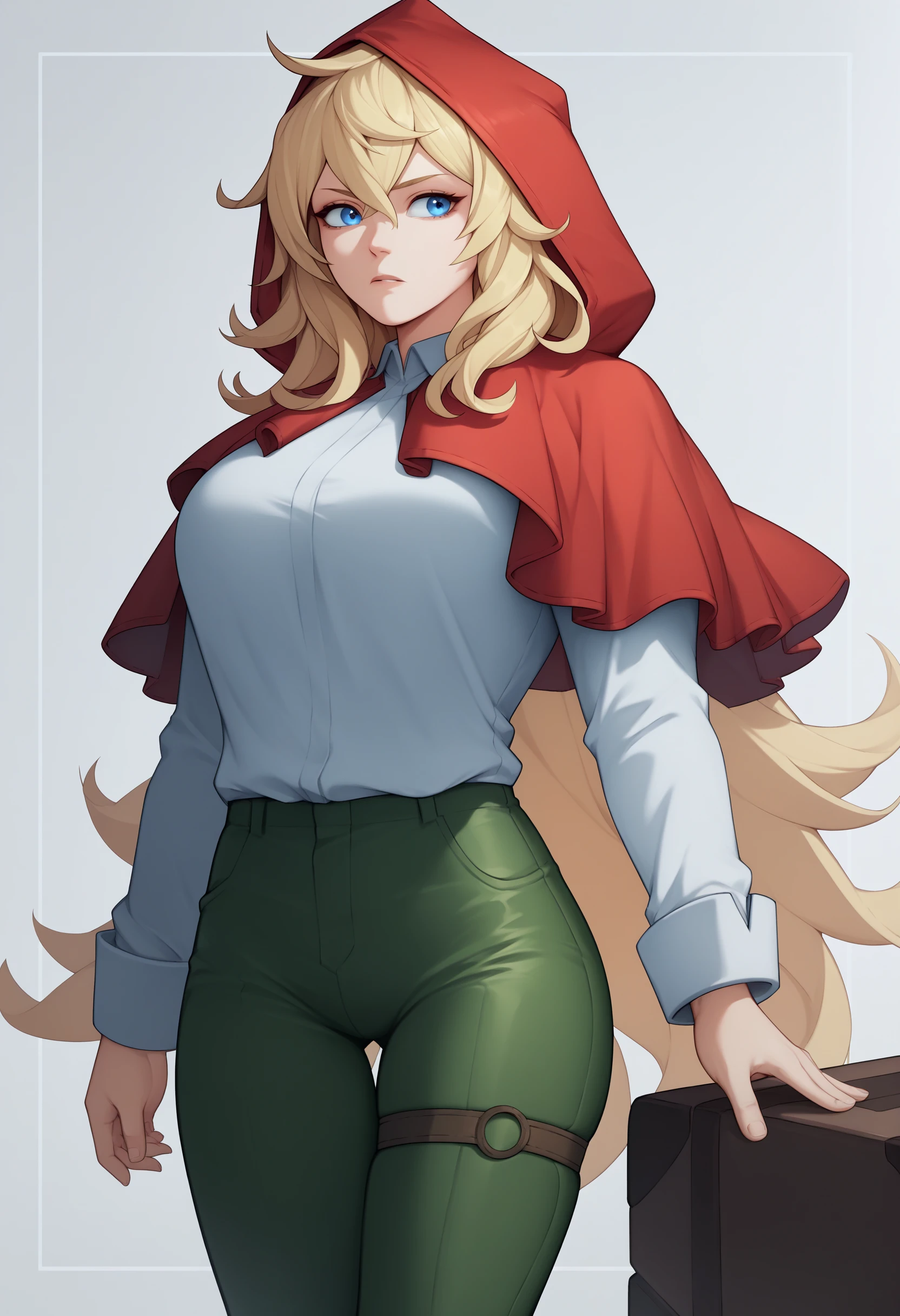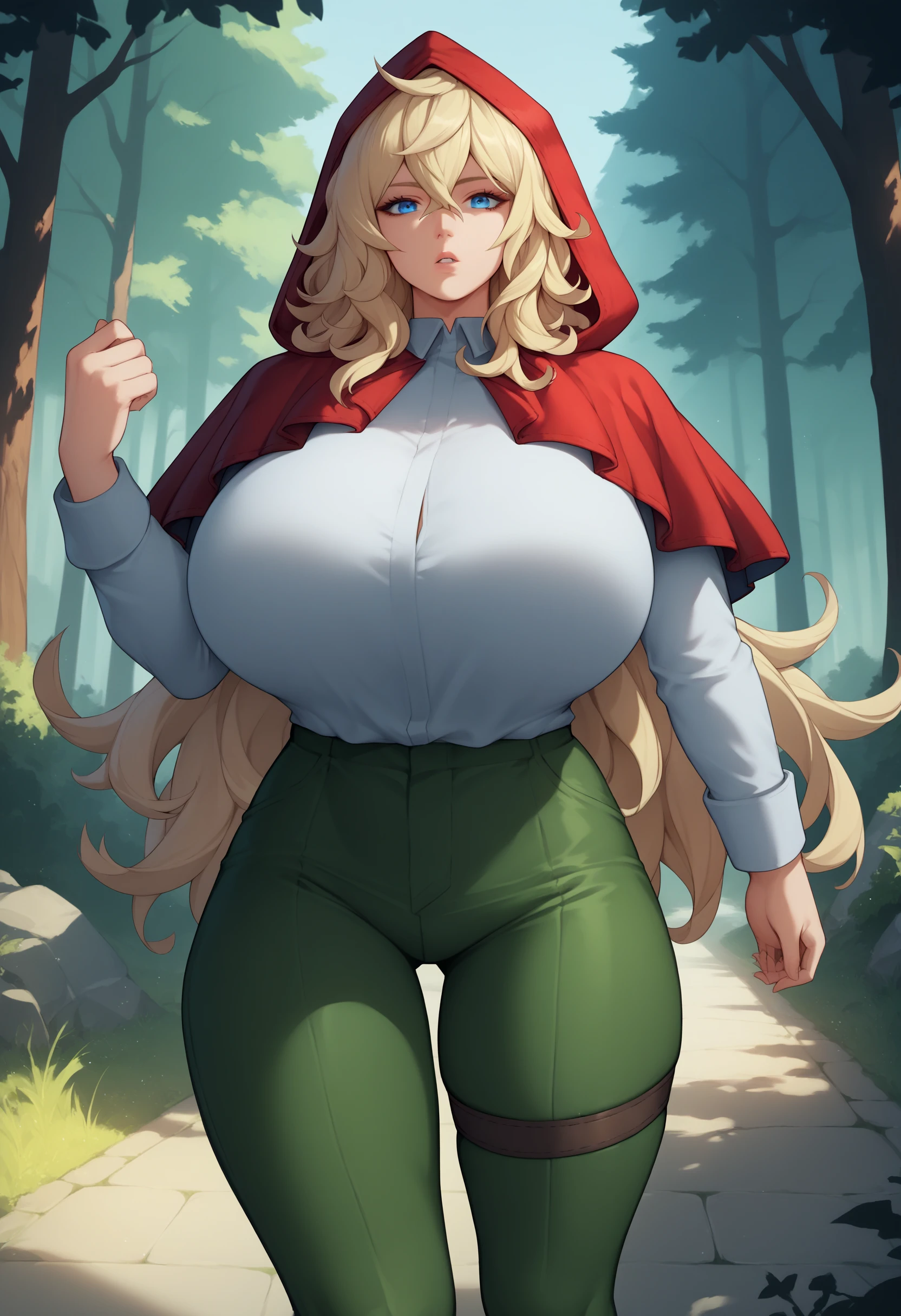 grimm, blonde hair, blue eyes, red hood, red capelet, white shirt, green pants, thigh strap, huge breasts