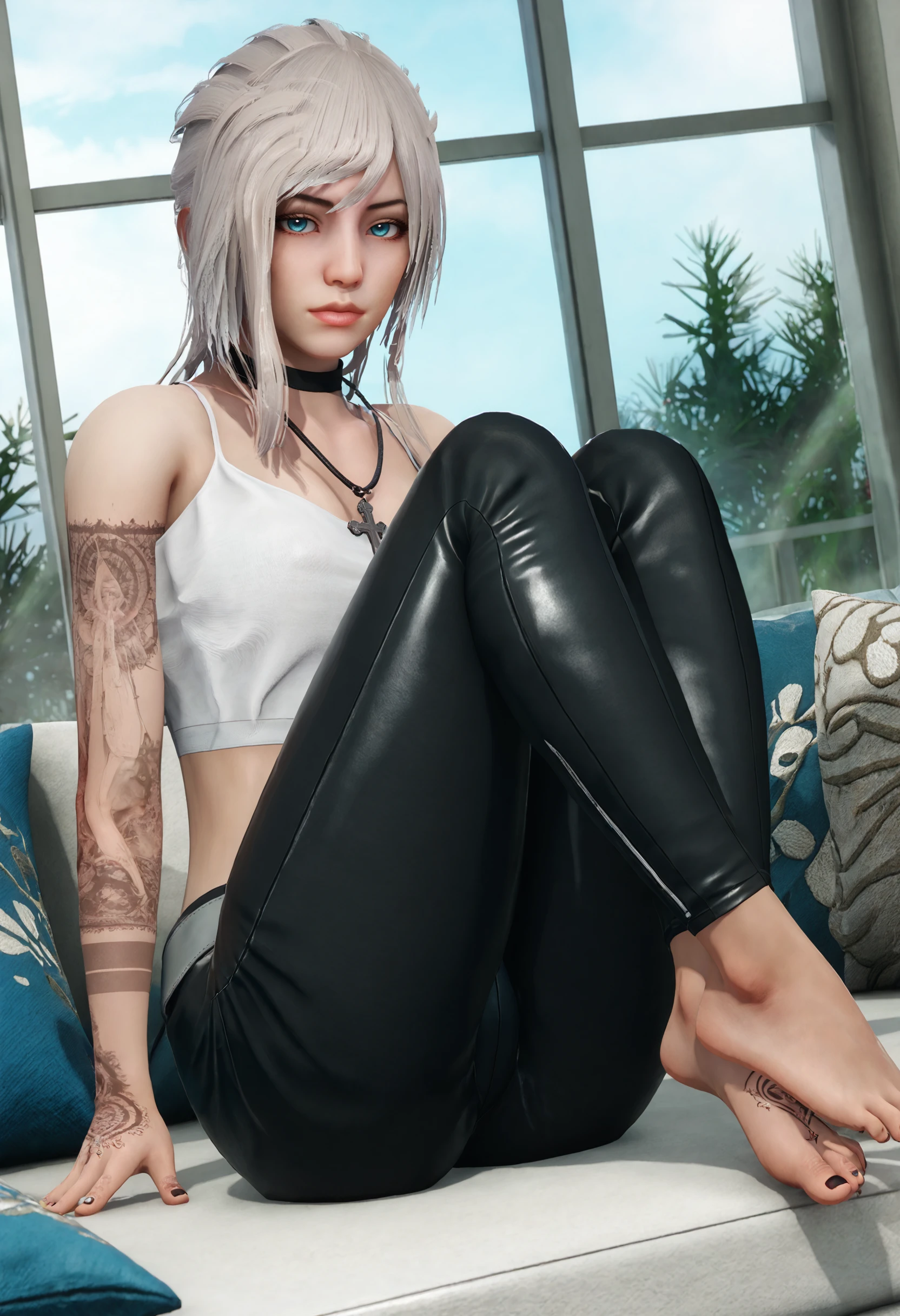 cross necklace, crop top, barefoot, black choker, feet, toes, toenail polish, toenails, midriff, navel, navel piercing, black pants, white belt, tattoo sleeve,