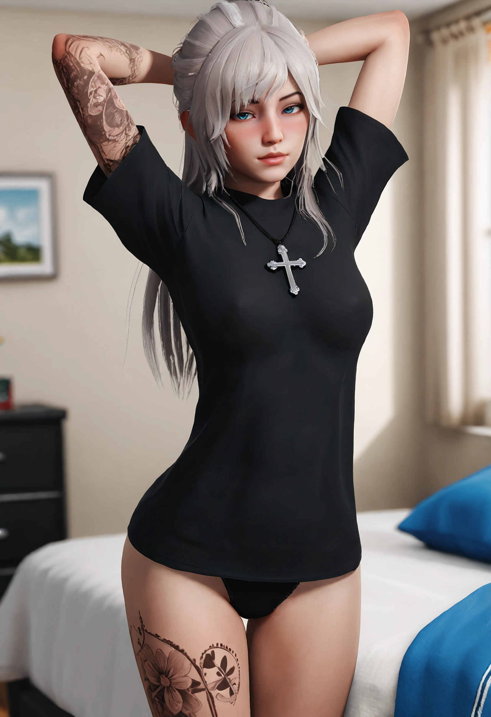 cross necklace, black shirt, blush, short sleeves, black panties, bangs, tattoo sleeve, thigh tattoo,