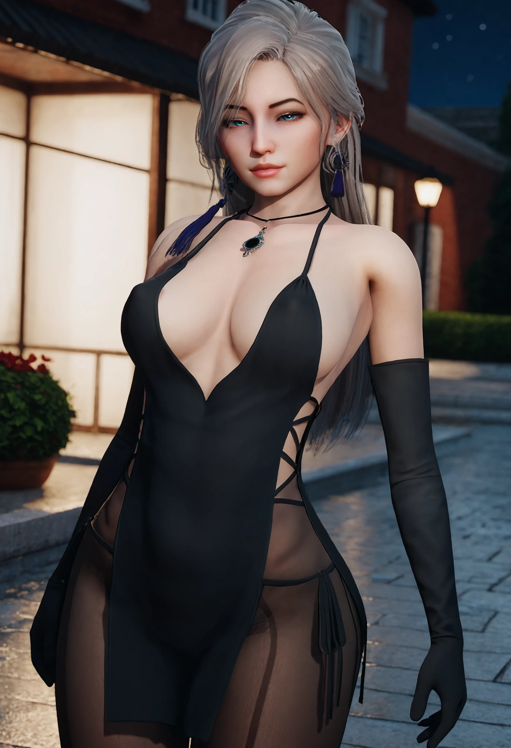 alexdrs, black dress, black pantyhose, black elbow gloves, tassel earrings, necklace, boots, side slit, underwear, panties, bare shoulders, no bra, cleavage,