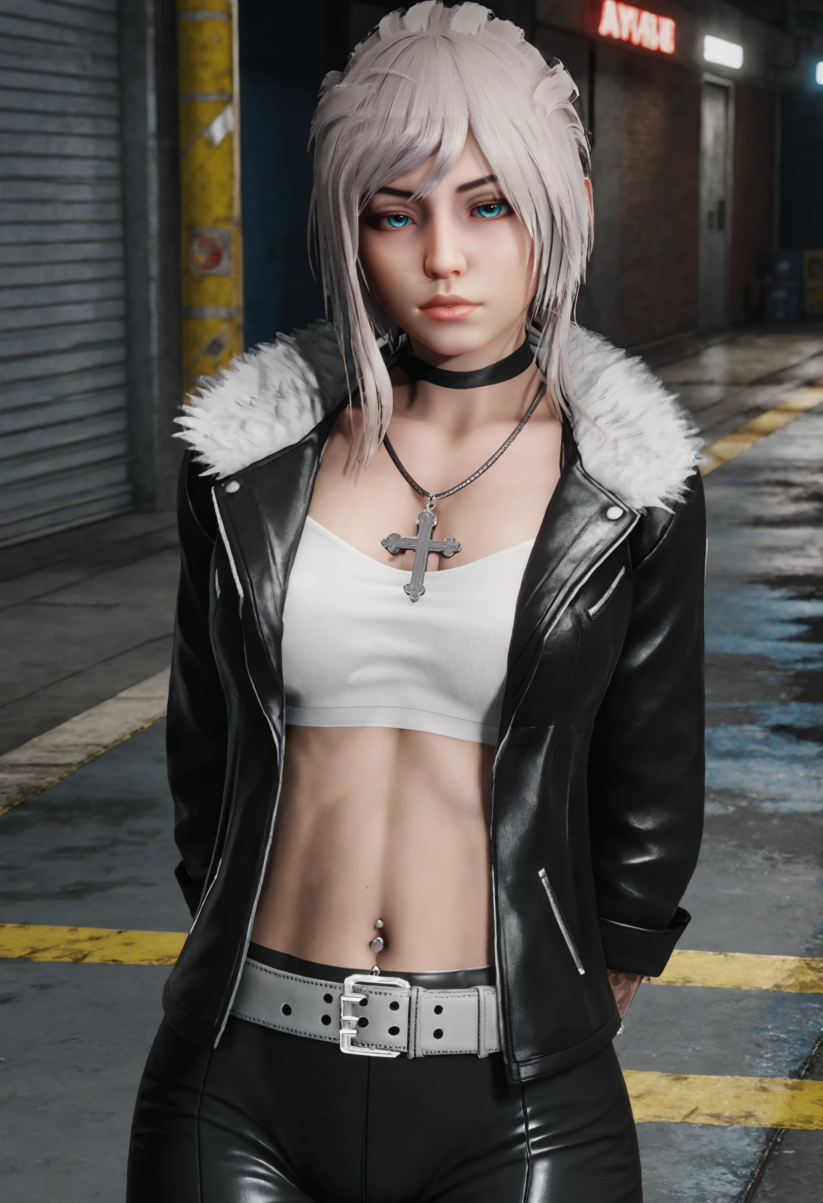 alexleath, navel piercing, cross necklace, black choker, leather pants, leather jacket, white belt, black pants, white fur trim, navel, open clothes, midriff, black jacket,