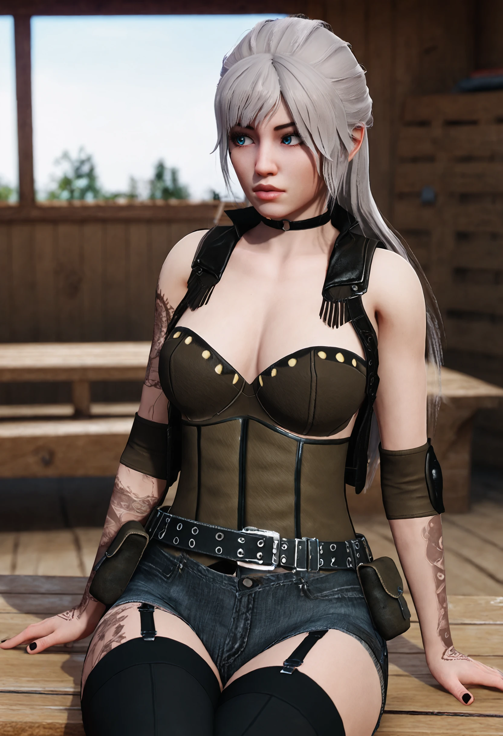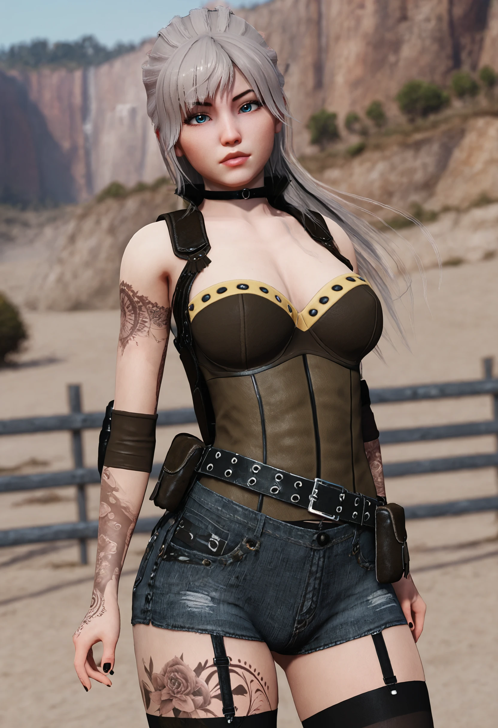alexwest, elbow pads, sleeveless, denim shorts, corset, choker, cleavage, denim, short shorts, belt, garter straps, black thighhighs, tattoo sleeve, thigh tattoo,