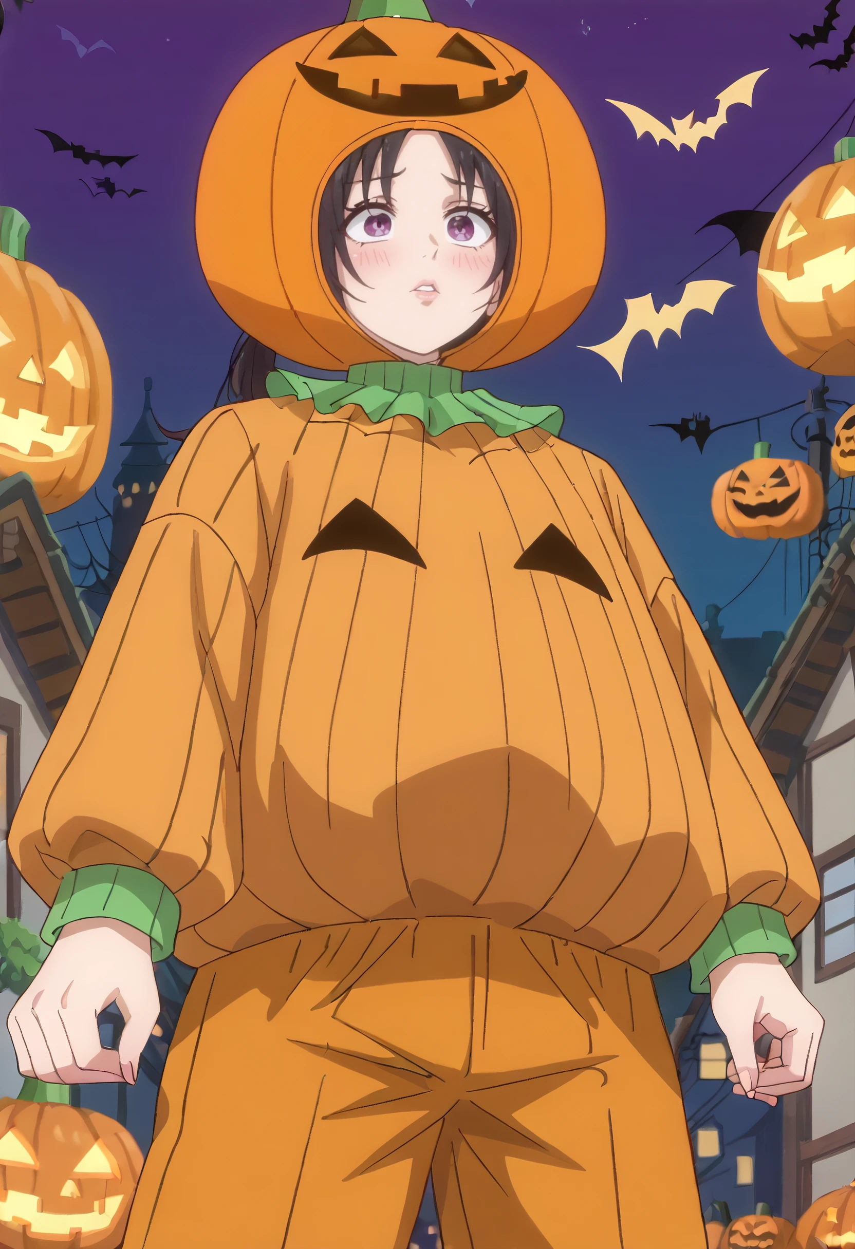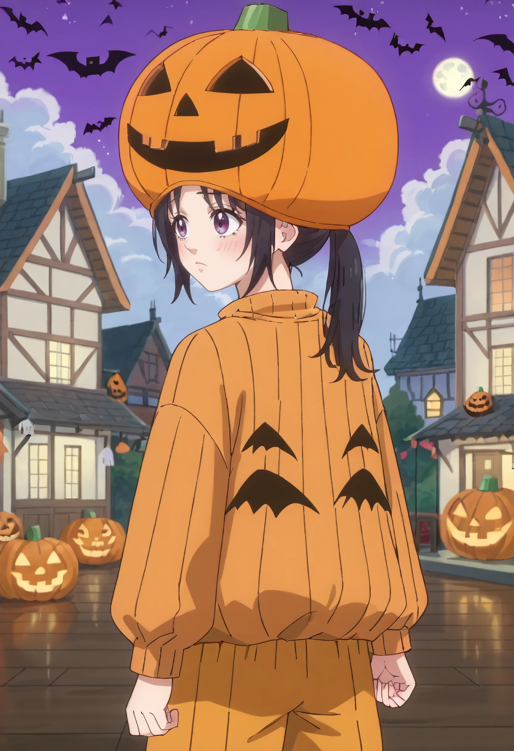 AkariHalloween, halloween, jack-o'-lantern, pumpkin, halloween costume, pumpkin hat, costume, short hair, long sleeves, orange headwear, pants, orange dress, trick or treat, helmet, sweater, brown pants, ribbed sweater, orange jacket,