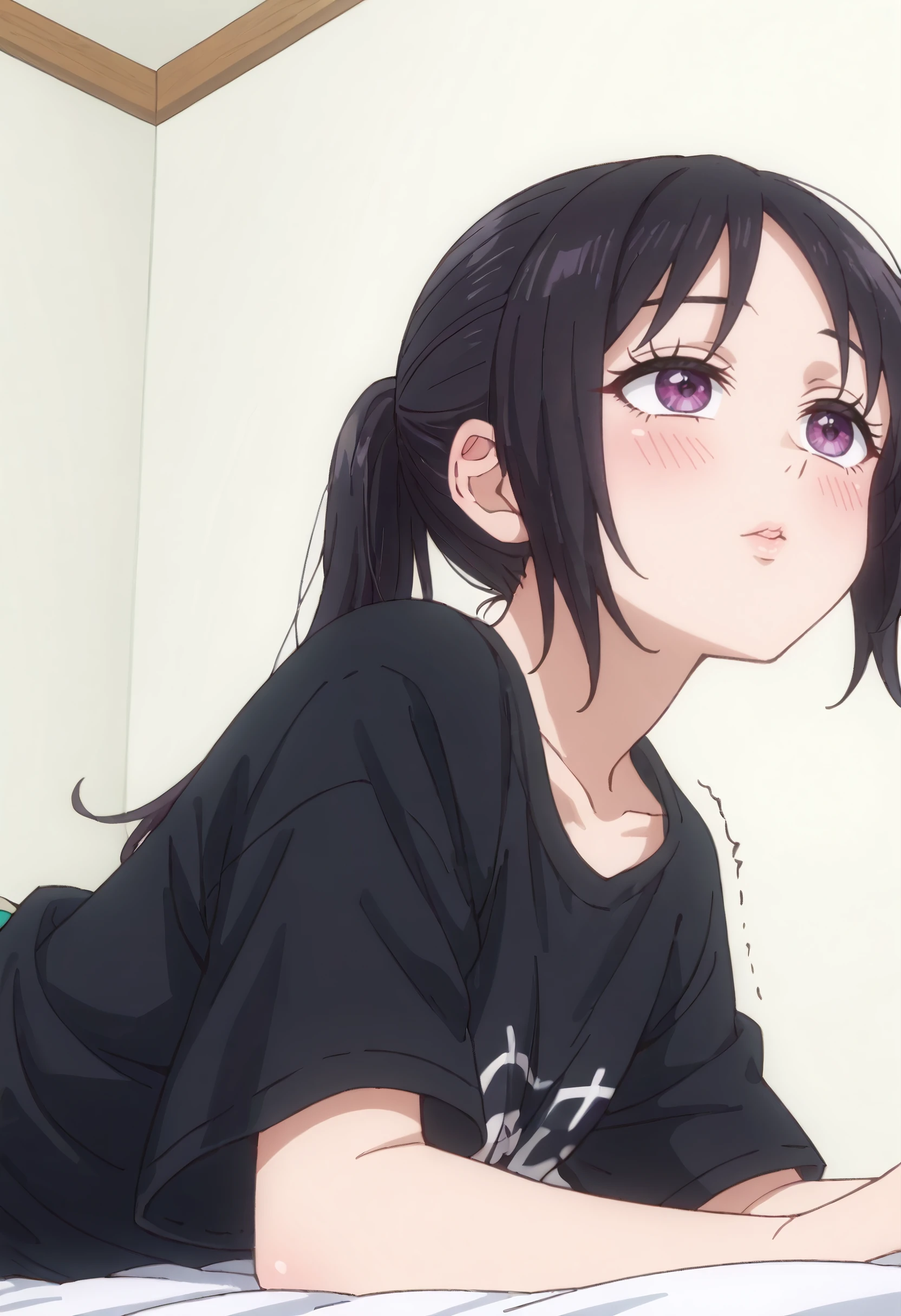 KMNAkari, black hair, purple eyes, long hair, ponytail,