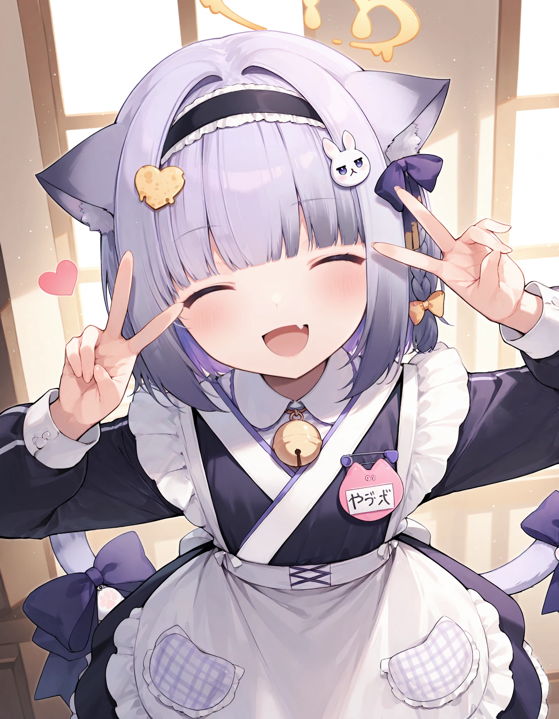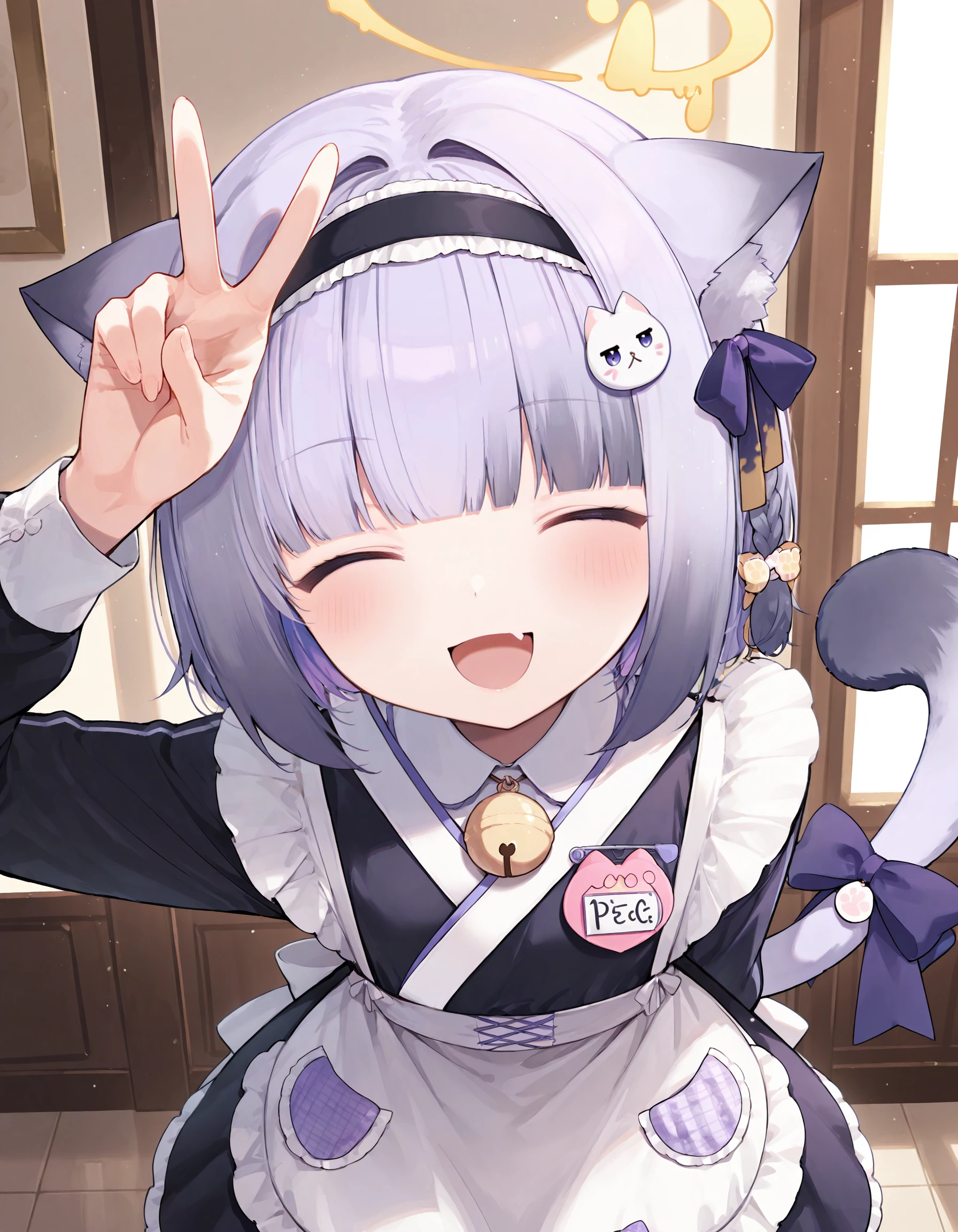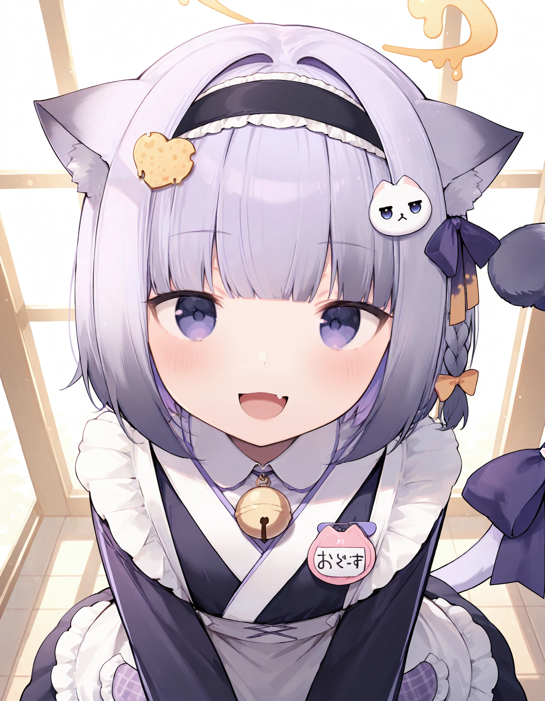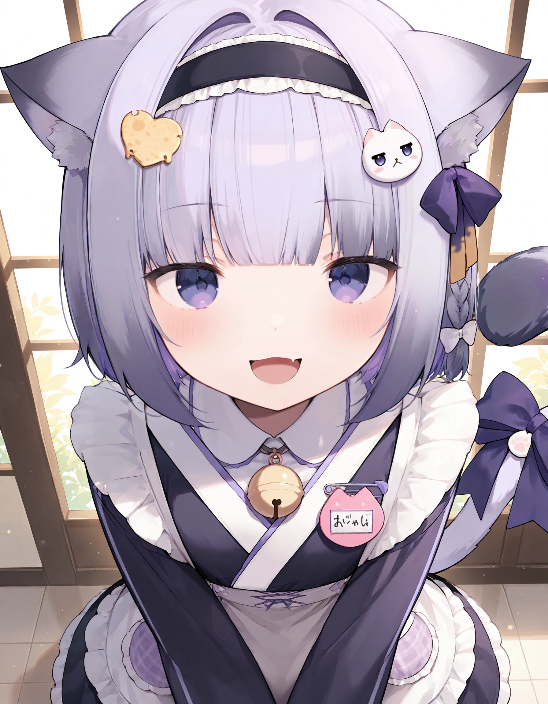 nyunko,grey hair,purple hair,multicolored hair,bangs,braid,short hair,purple eyes,cat ears,animal ear fluff,cat tail,fang,black hairband,maid headdress,hair ornament,cat hair ornament,bell,jingle bell,name tag,white shirt,collared shirt,white apron,frilled apron,frills,purple bow,tail bow,tail ornament,