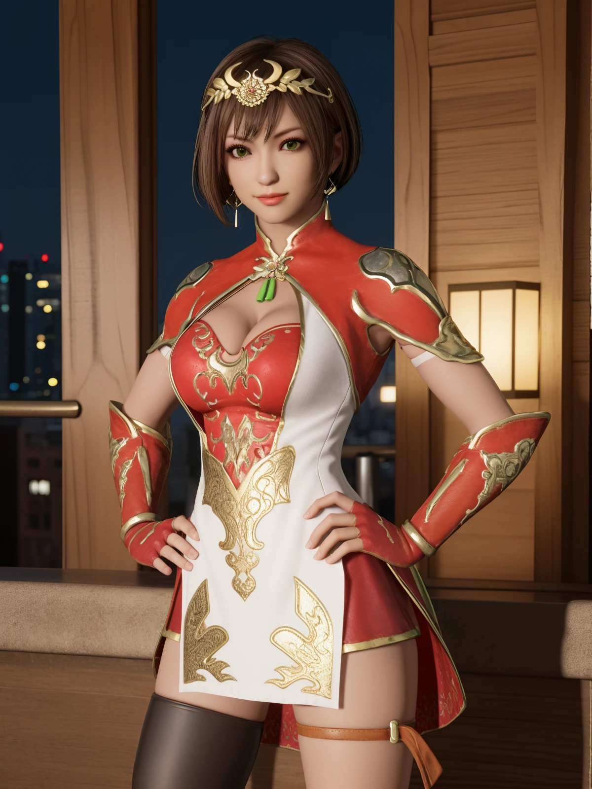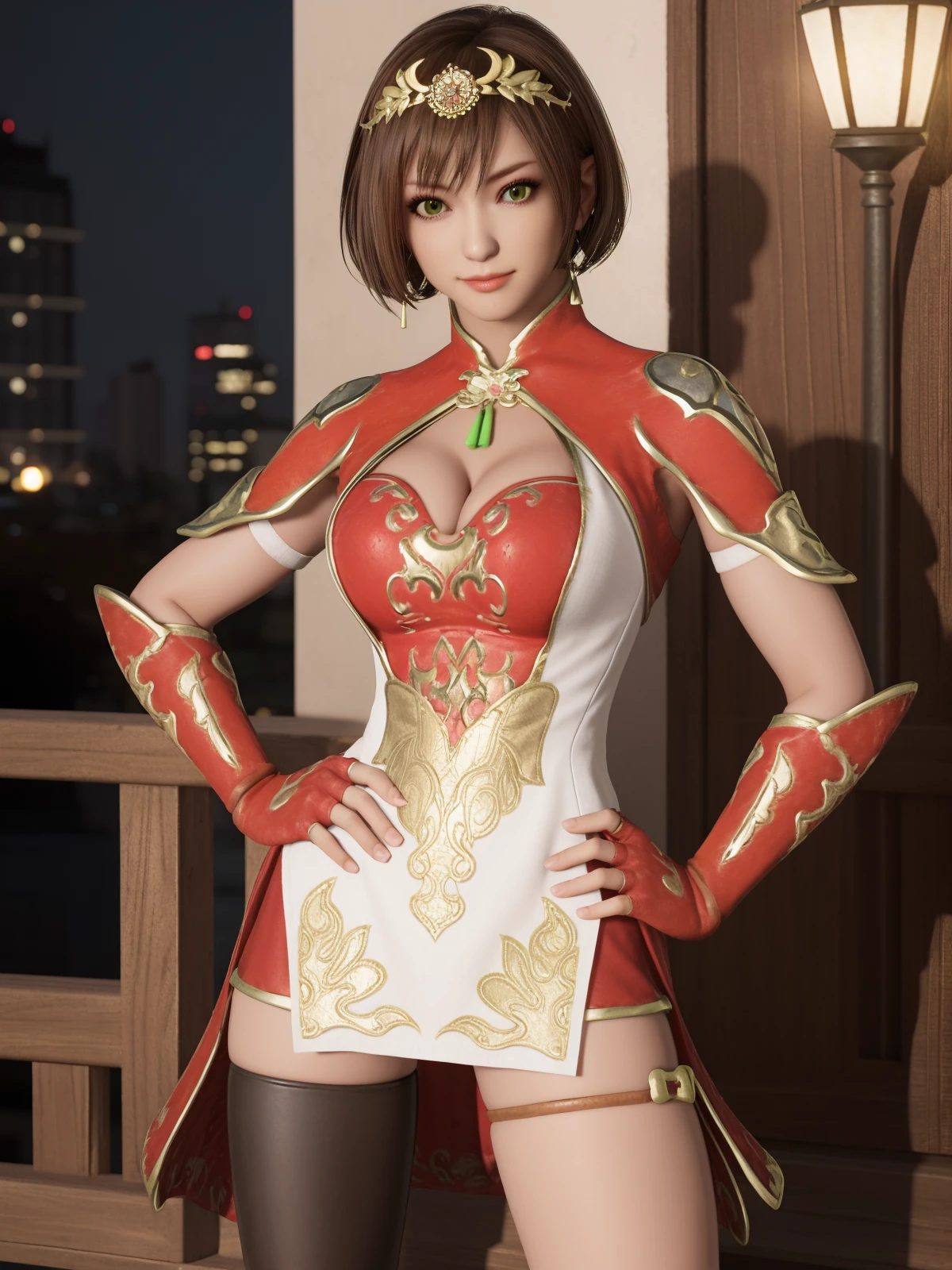 ZSGWSsunshangxiangYP, 1girl, solo, brown hair, short hair, fingerless gloves, jewelry, breasts, earrings, cleavage, green eyes, looking at viewer, cleavage cutout, brown eyes,medium breasts, armor,single thighhigh,boots,vambraces, cityscape, night, hand on hip,