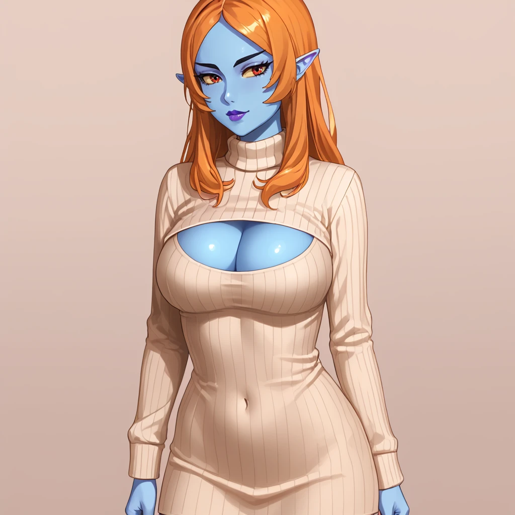 Trigger :midna, 1girl, blue skin, front ponytail, yellow sclera, navel, orange hair, medium breasts, red eyes, two-tone skin, long hair, hood up, purple lips, pelvic curtain, pointy ears, stomach, bridal gauntlets