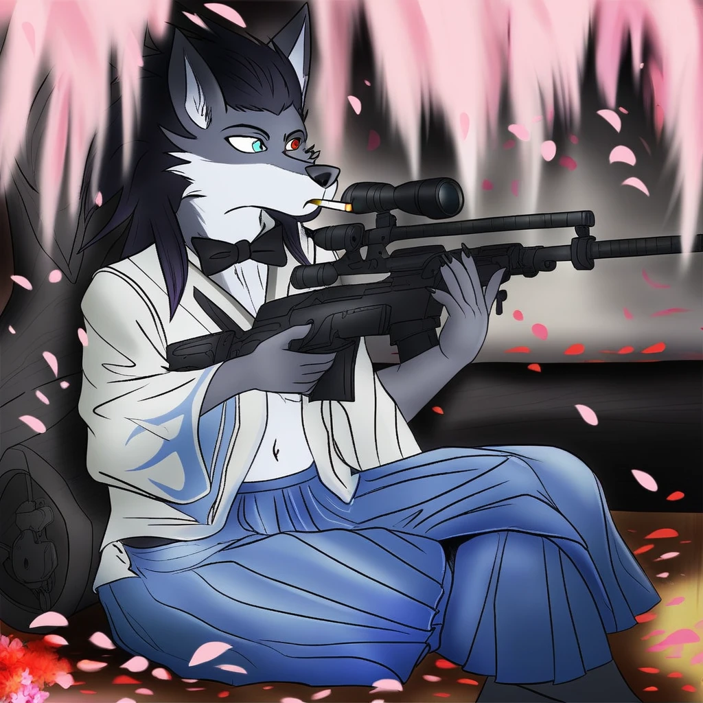 Anthro, black fur, green eyes, black hair, purple hair, male,