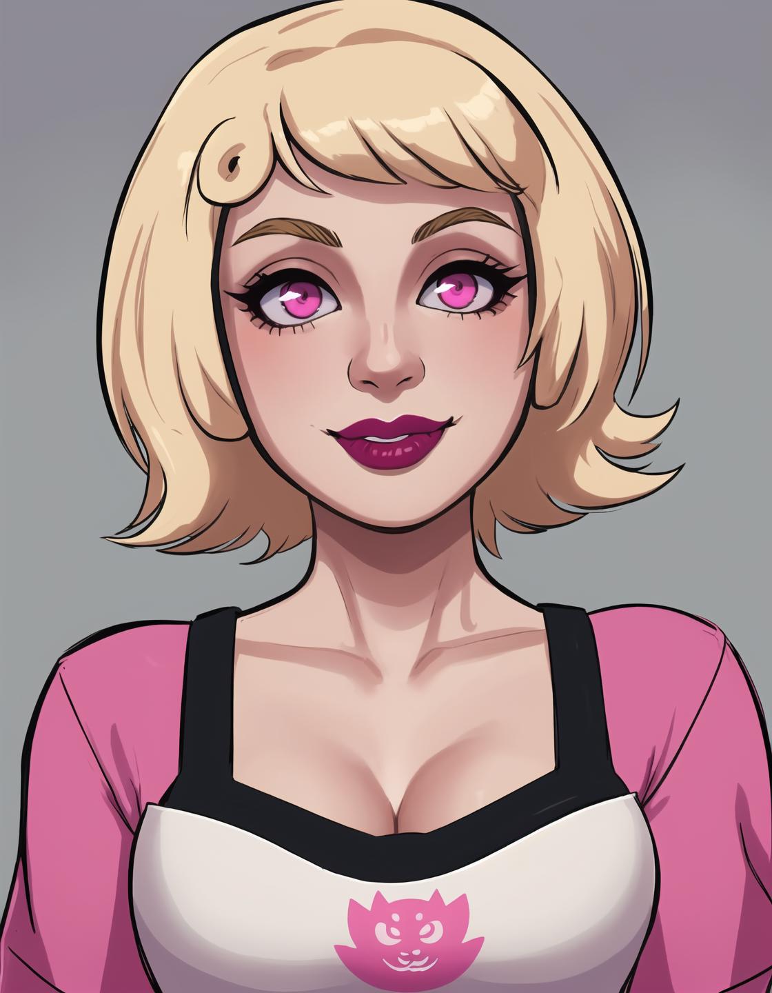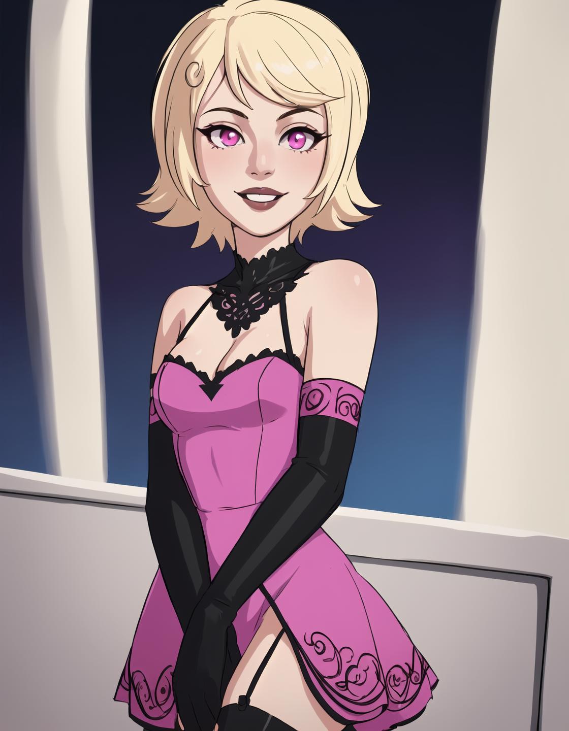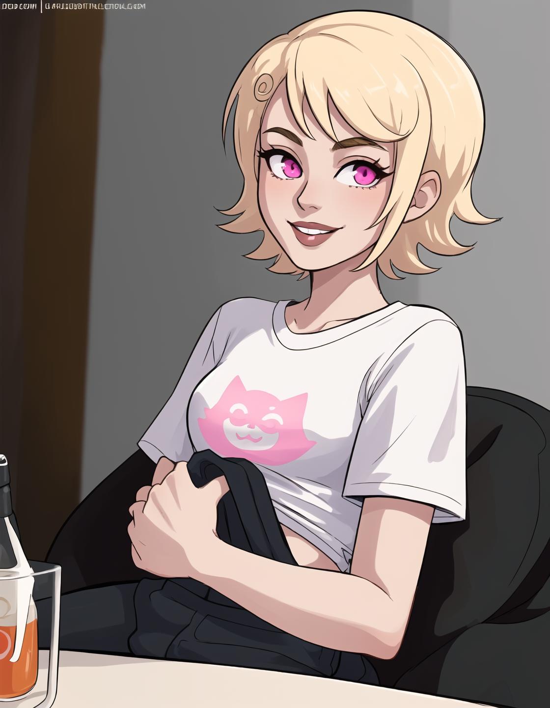 Situational prompts: 1girl, blonde hair, short hair, pink eyes, parted lips