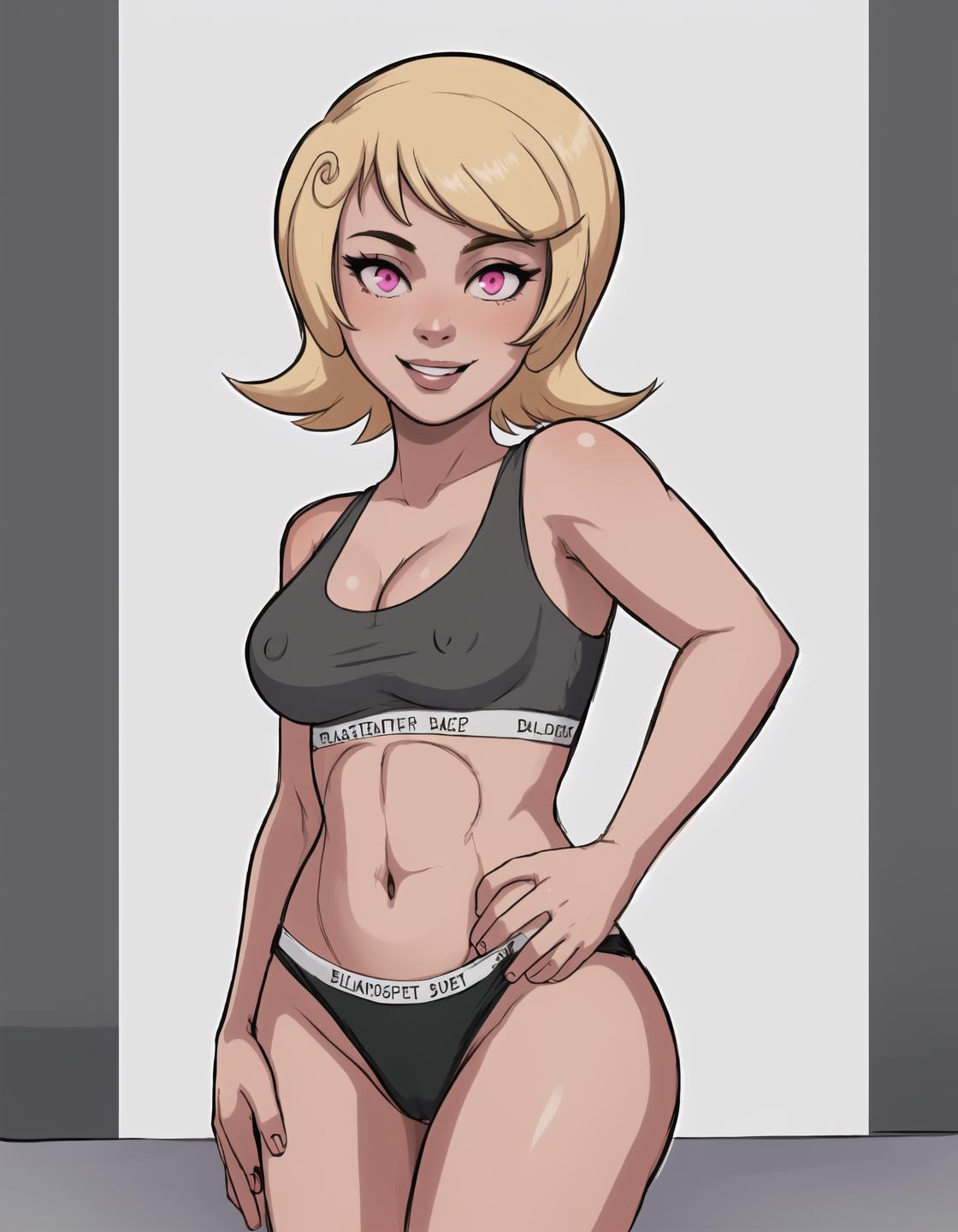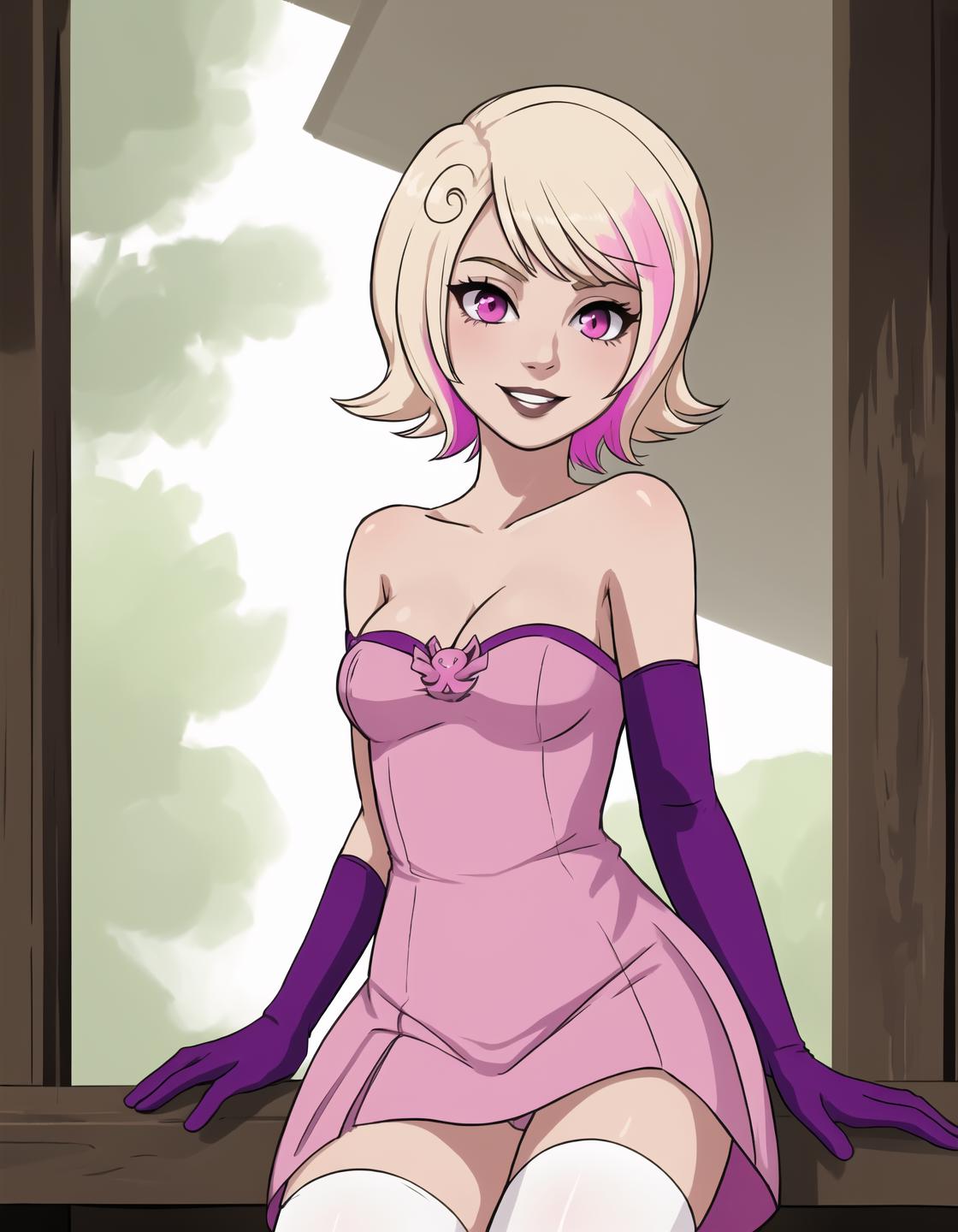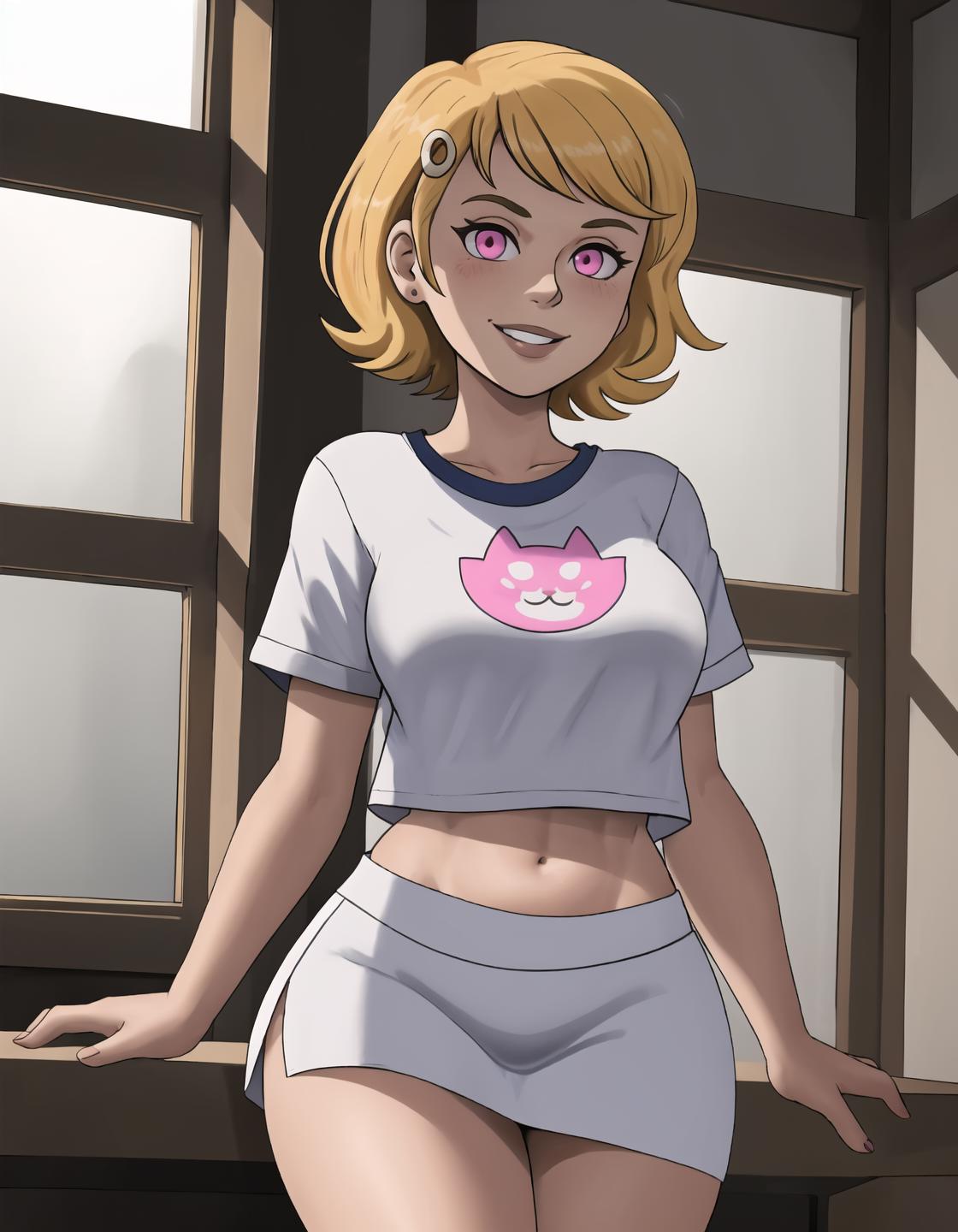Situational prompts: 1girl, blonde hair, short hair, pink eyes, parted lips
