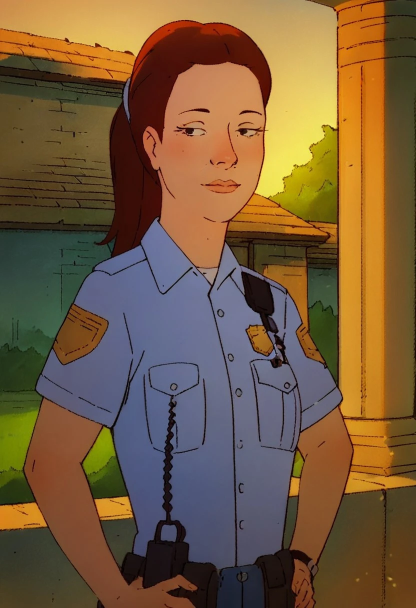 policewoman, police uniform, blue shirt, short sleeves, breast pocket, belt, holster, walkie-talkie, gun, blue pants