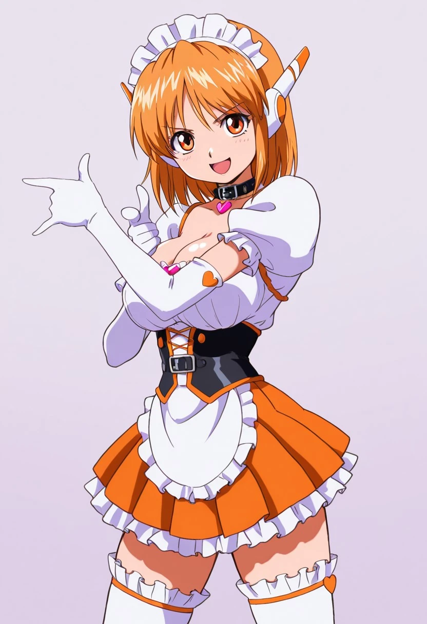 Outfit 02 (jelly): maid headdress, black belt collar with white frills, robot ears, white frilled puffy short sleeves, white elbow gloves with orange accents and pink heart on sleeve, front waist heart accessory, cleavage, underbust corset, orange pleated miniskirt, frilled white thighhighs with orange accents, white with orange accents ankle boots with pink heart,