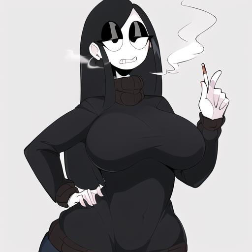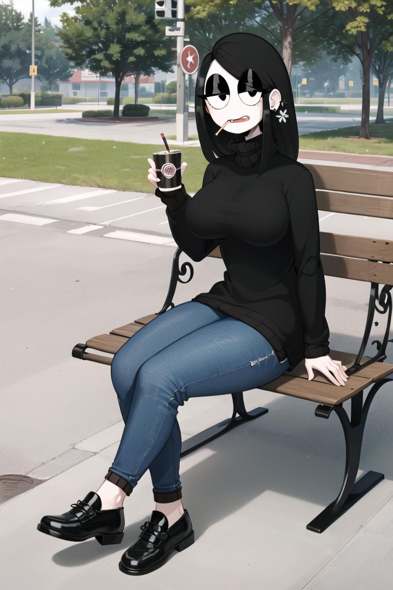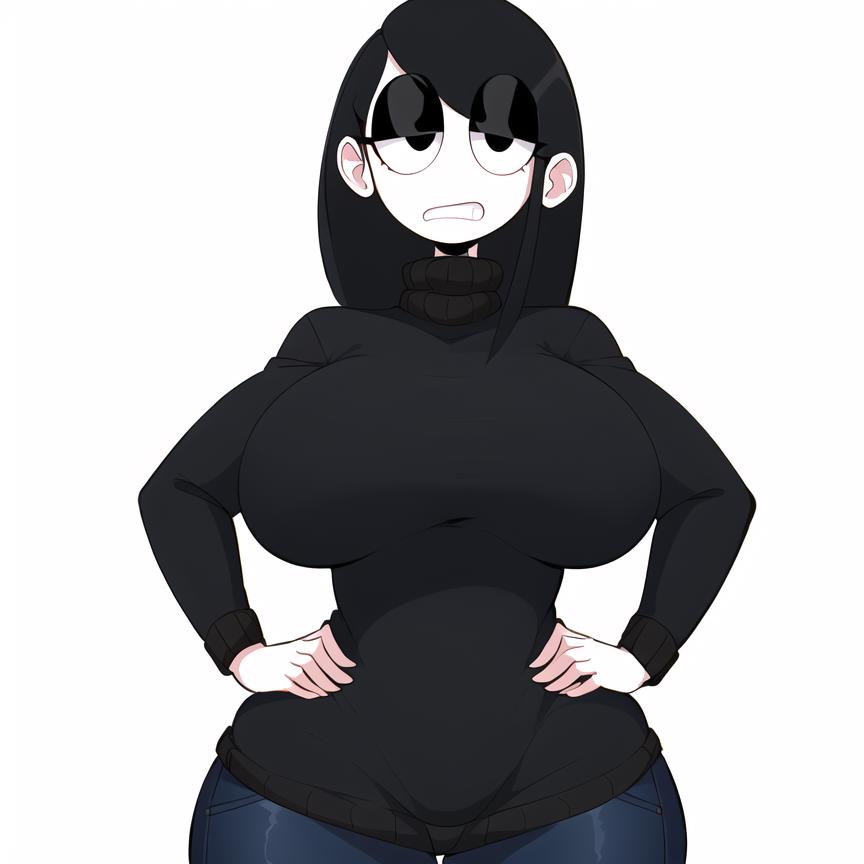 best tags: 1girl, solo, black eyes, black turtleneck sweater, jean pants