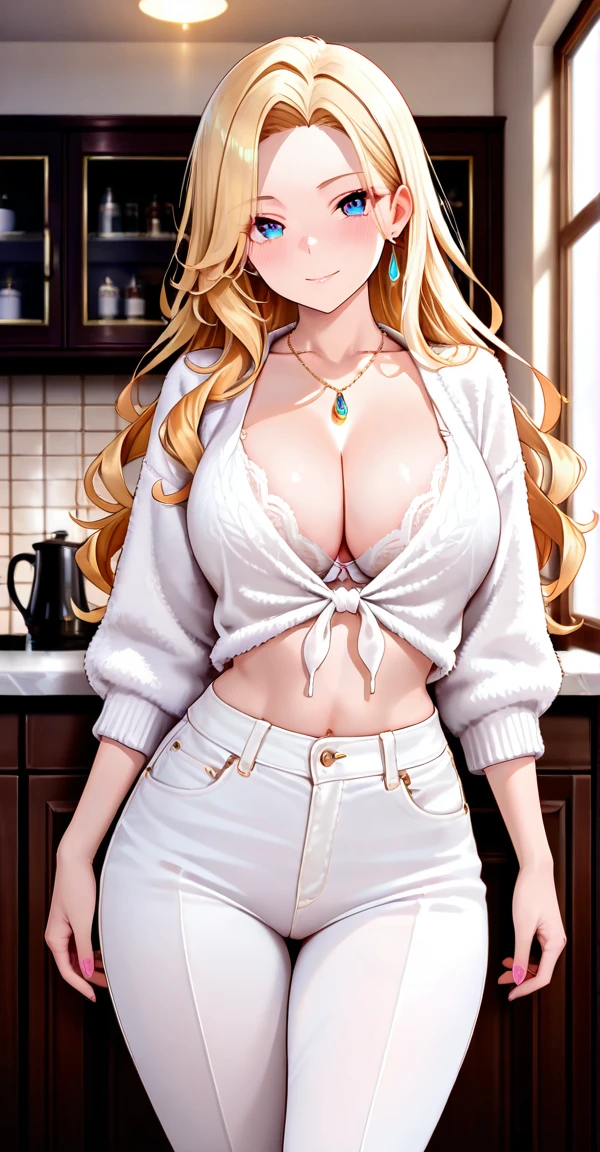 xg1, white pants, white lace bra, light cream fluffy tie-front crop cardigan, cleavage, midriff, jewelry, necklace