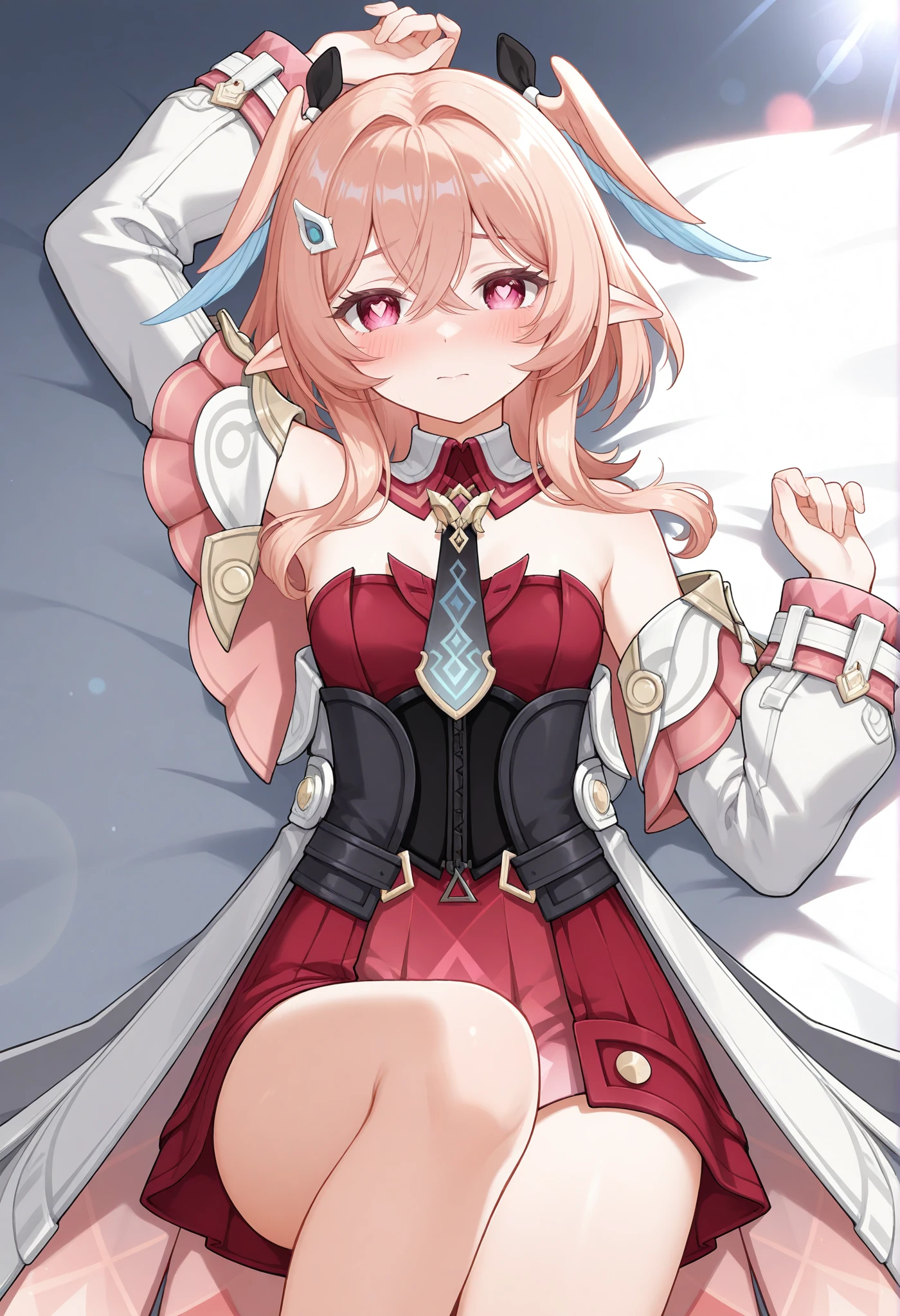 long sleeves,detached collar,red dress,detached sleeves,white sleeves,open coat,white coat,short dress,strapless dress,black necktie,off-shoulder coat,black corset,————————————