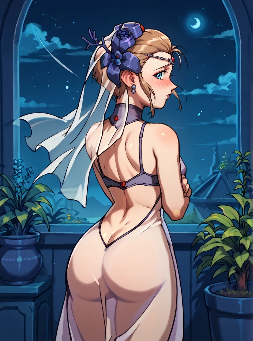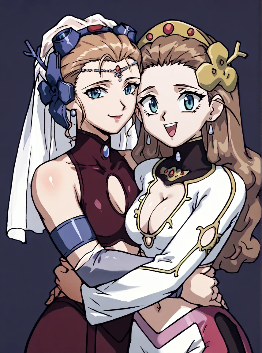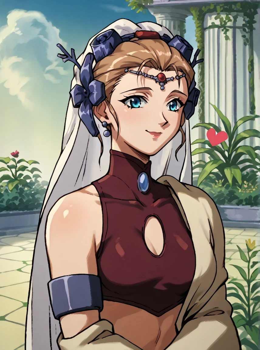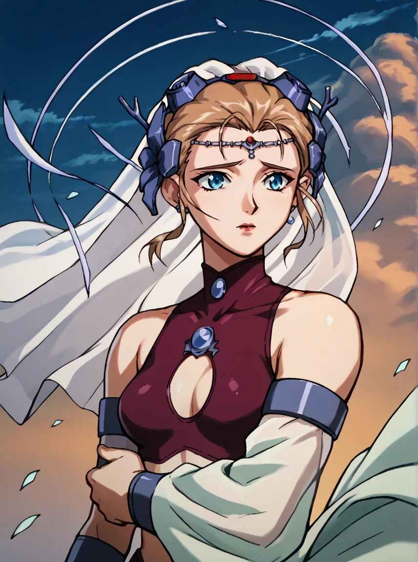 Runeova, 1girl, blue eyes, light brown updo hair, V4nVa tiara with veil, breasts, R9n4Va outfit,