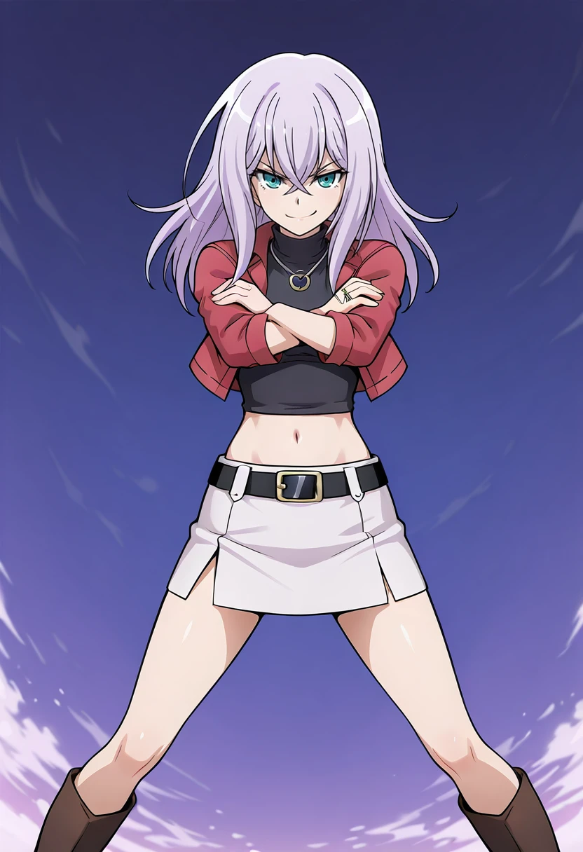 mski_tokura, vs_casual, lavender hair, hair between eyes, long hair, cyan eyes, ring necklace, red jacket, cropped jacket, black shirt, turtleneck shirt, cropped shirt, navel, midriff, black belt, white skirt, pencil skirt, black boots, knee boots