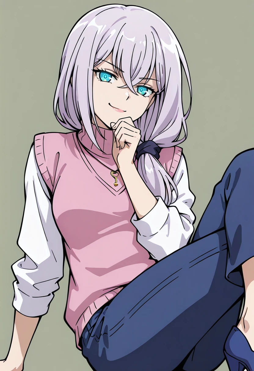 mski_tokura, gnext_casual, lavender hair, hair between eyes, hair over shoulder, low ponytail, cyan eyes, lipstick, key necklace, pink sweater, sweater vest, turtleneck sweater, white shirt, long sleeves, blue pants, blue heels