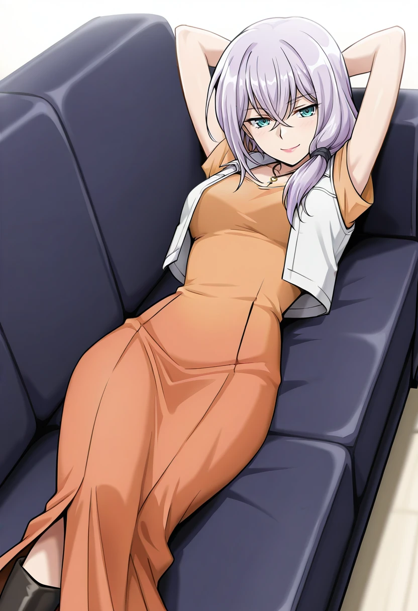 mski_tokura, gs_casual, lavender hair, hair between eyes, hair over shoulder, low ponytail, cyan eyes, lipstick, key necklace, white vest, cropped vest, orange dress, long dress, black boots