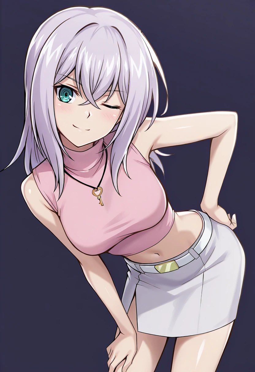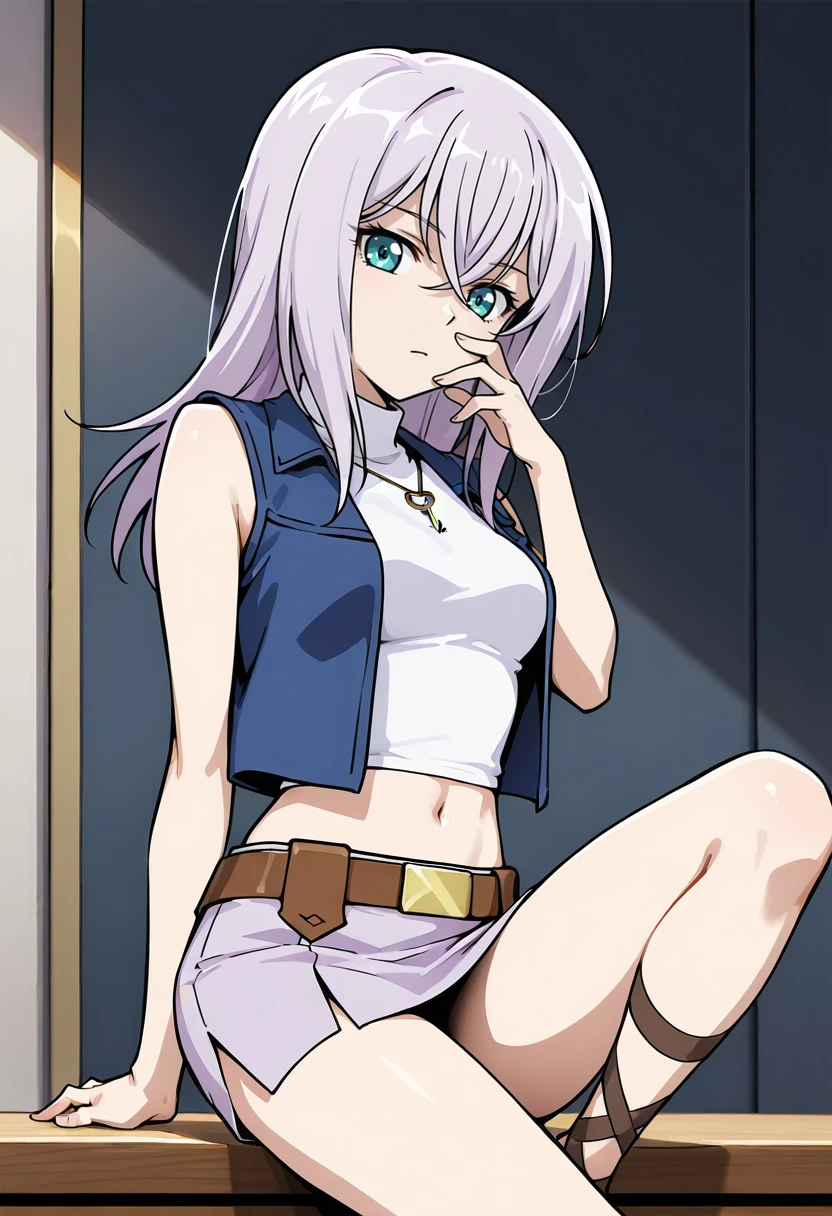 mski_tokura, s2_tourney, lavender hair, hair between eyes, long hair, cyan eyes, key necklace, blue vest, open vest, cropped vest, turtleneck shirt, white shirt, cropped shirt, sleeveless shirt, navel, midriff, brown belt, lavender skirt, pencil skirt, mini skirt, side slit, ankle lace-up