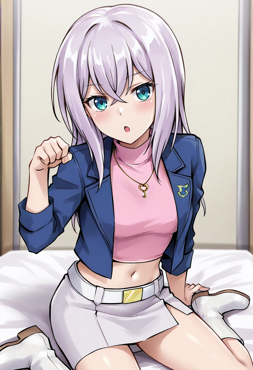 mski_tokura, asia_circuit_msk, lavender hair, hair between eyes, long hair, cyan eyes, key necklace, blue jacket, open jacket, turtleneck shirt, pink shirt, cropped shirt, white belt, white skirt, pencil skirt, side slit, white boots
