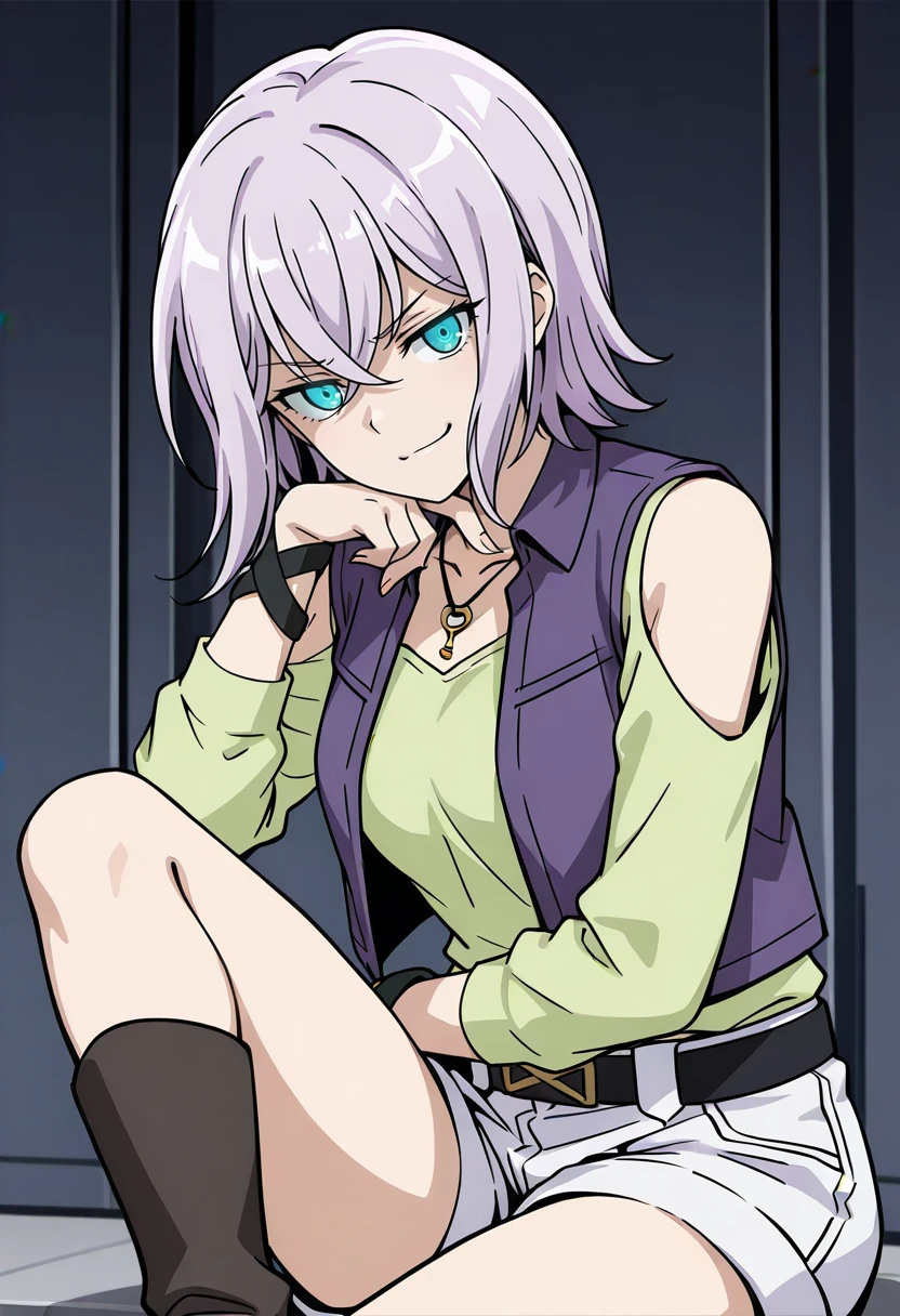 mski_tokura, legion_casual, lavender hair, hair between eyes, short hair, cyan eyes, key necklace, purple vest, sleeveless vest, green shirt, long sleeves, shoulder cutout, wrist straps, criss-cross straps, black belt, white shorts, black boots