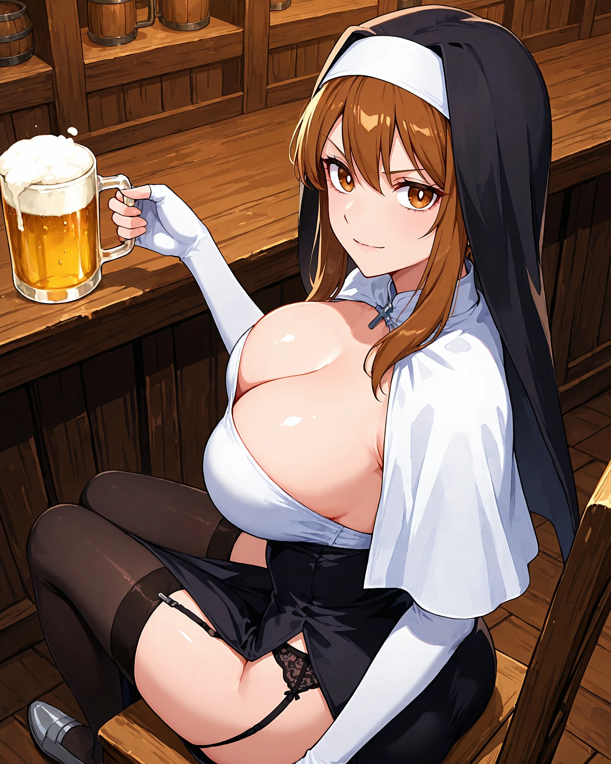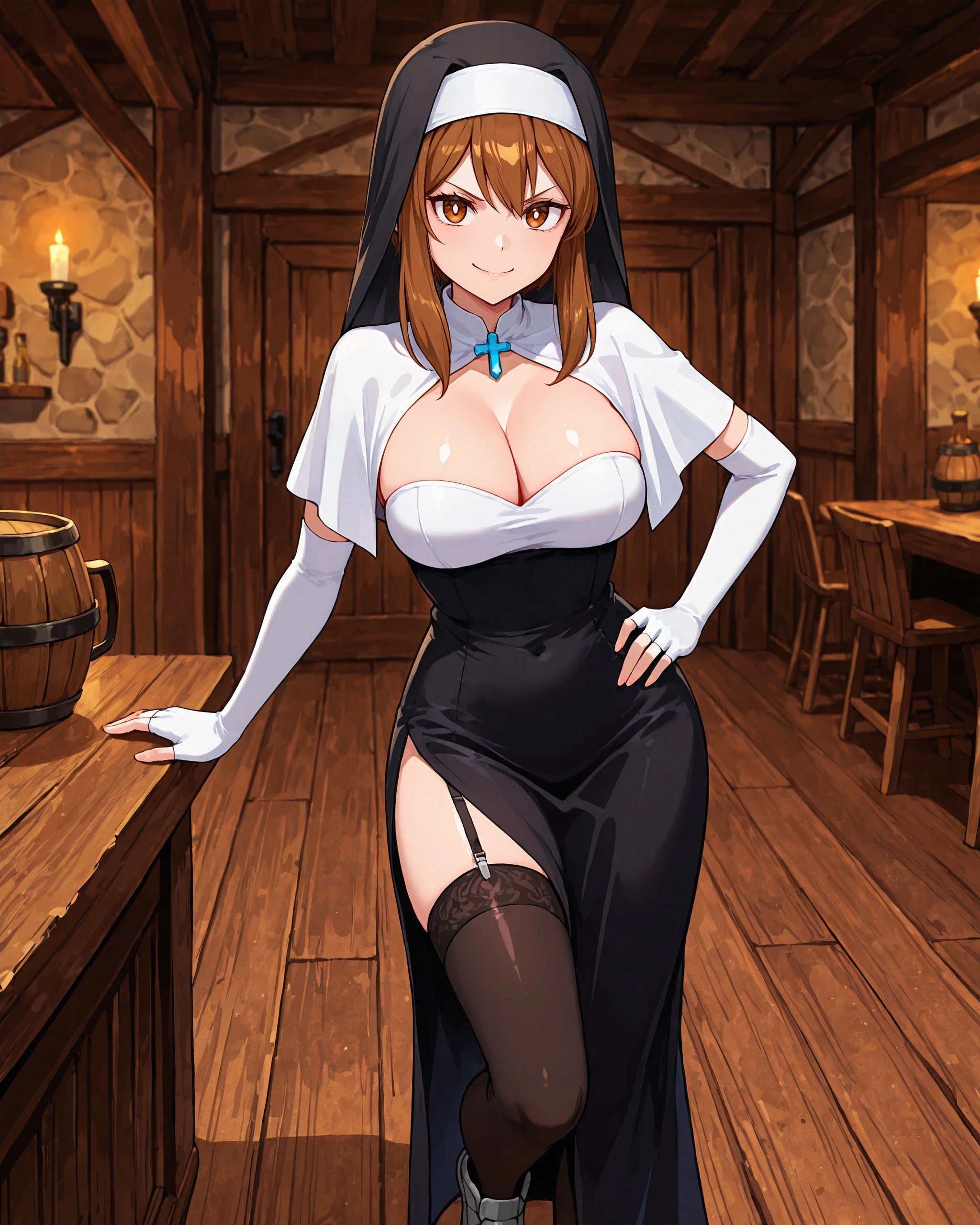 if the cross starts getting too misshapen, a "grey cross pendant" keyword can be added, although because it uses the common word "cross" this will also occasionally add crosses in random places, like on walls, on her shoulders or even the veil.