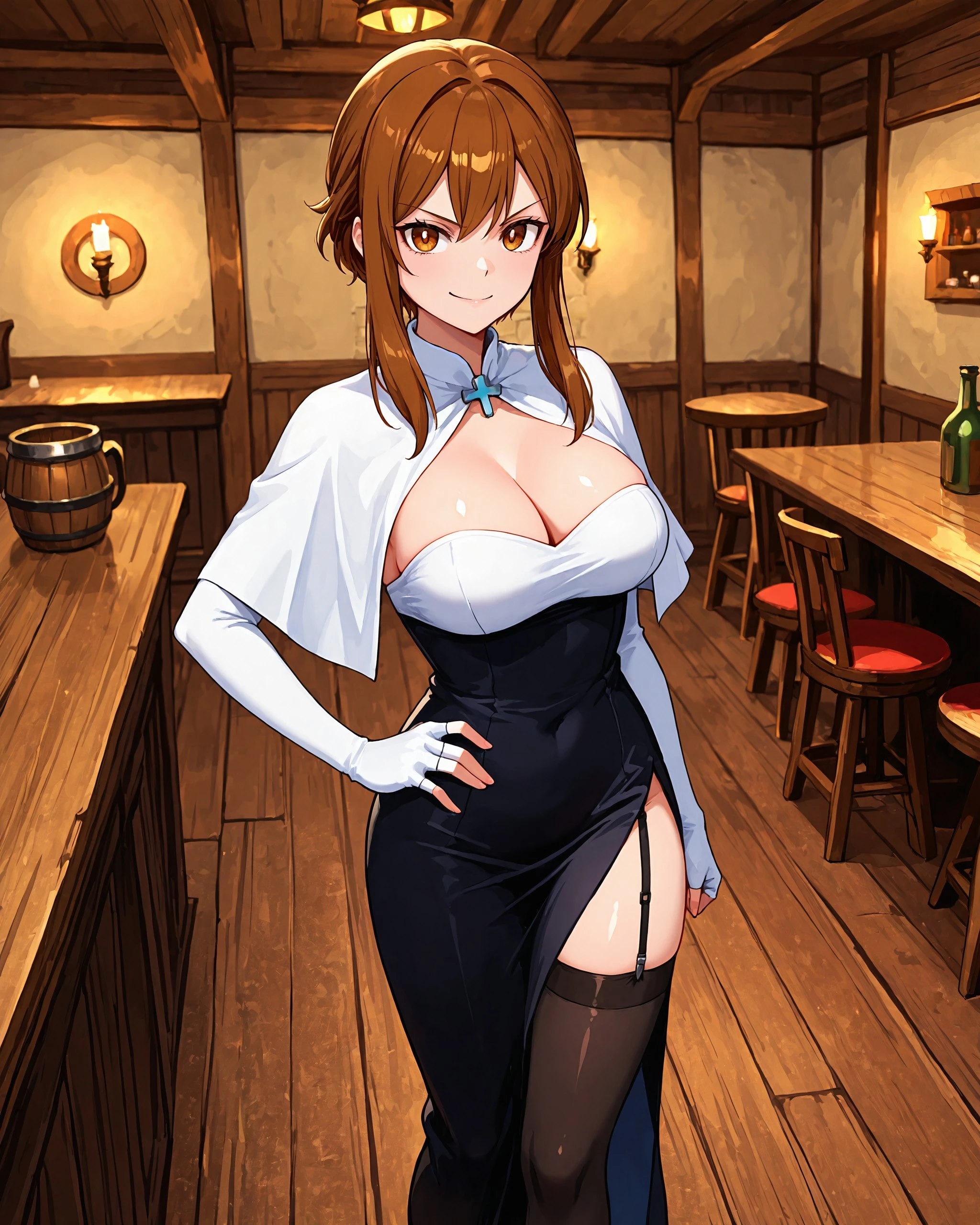black veil, white capelet, cleavage, black dress, side slit, (white strapless bra:1.1), black thighhighs, black garter straps, (white elbow gloves:1.1), white fingerless gloves, grey shoes,