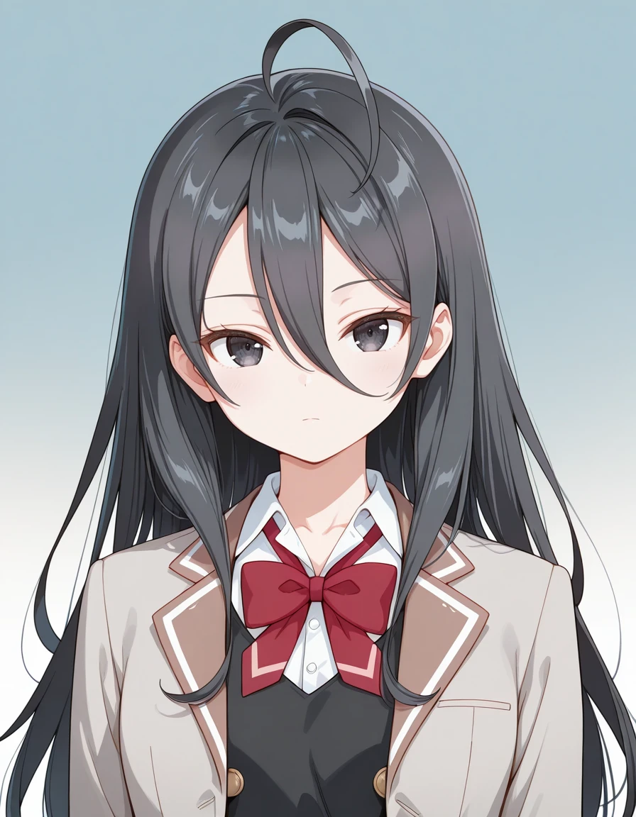 <lora:ayano_kimishima_anime_v5-soralz:1>, ayano kimishima, long hair, black hair, ahoge, hair between eyes, long bangs, black eyesOutfit - School Uniform