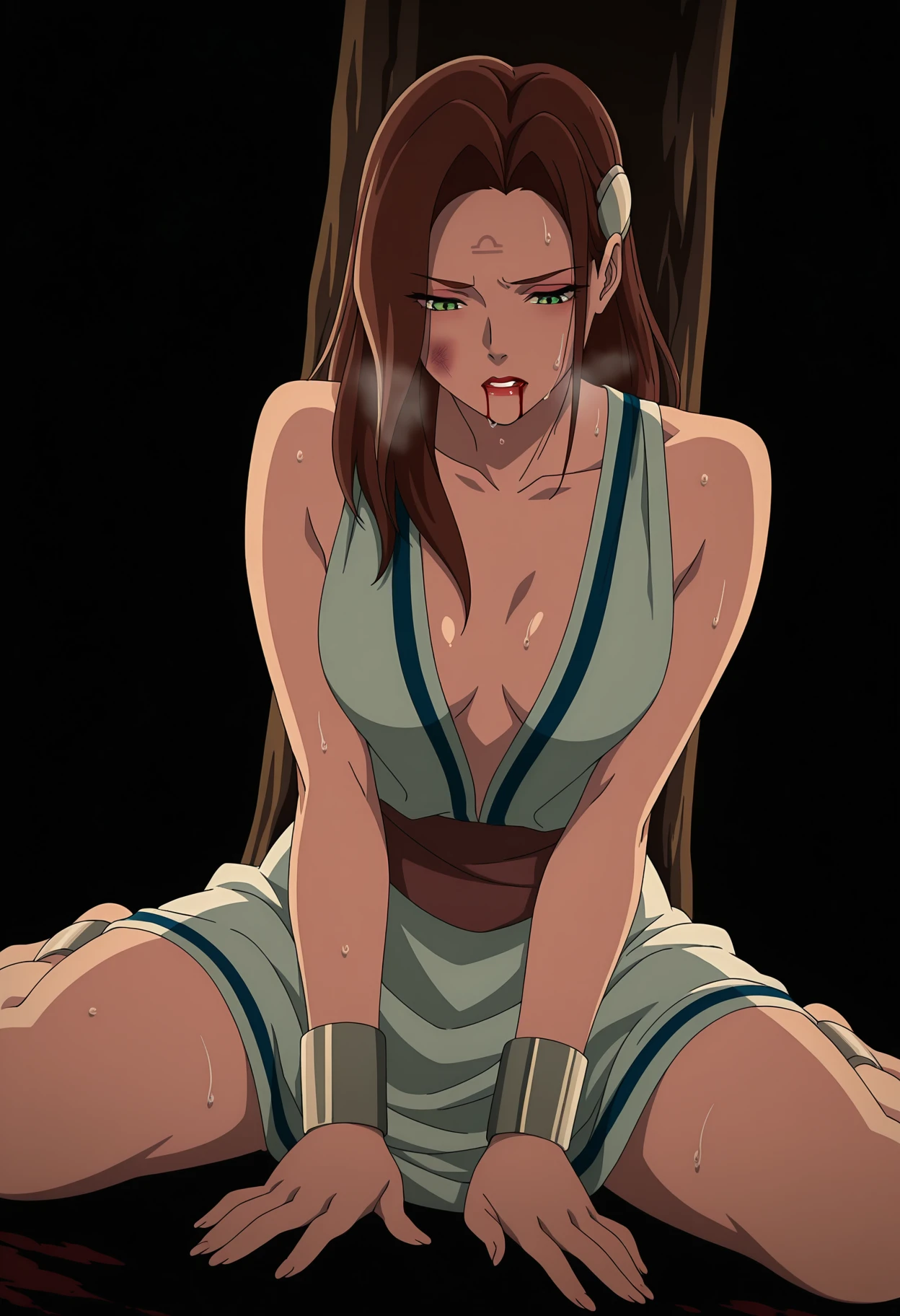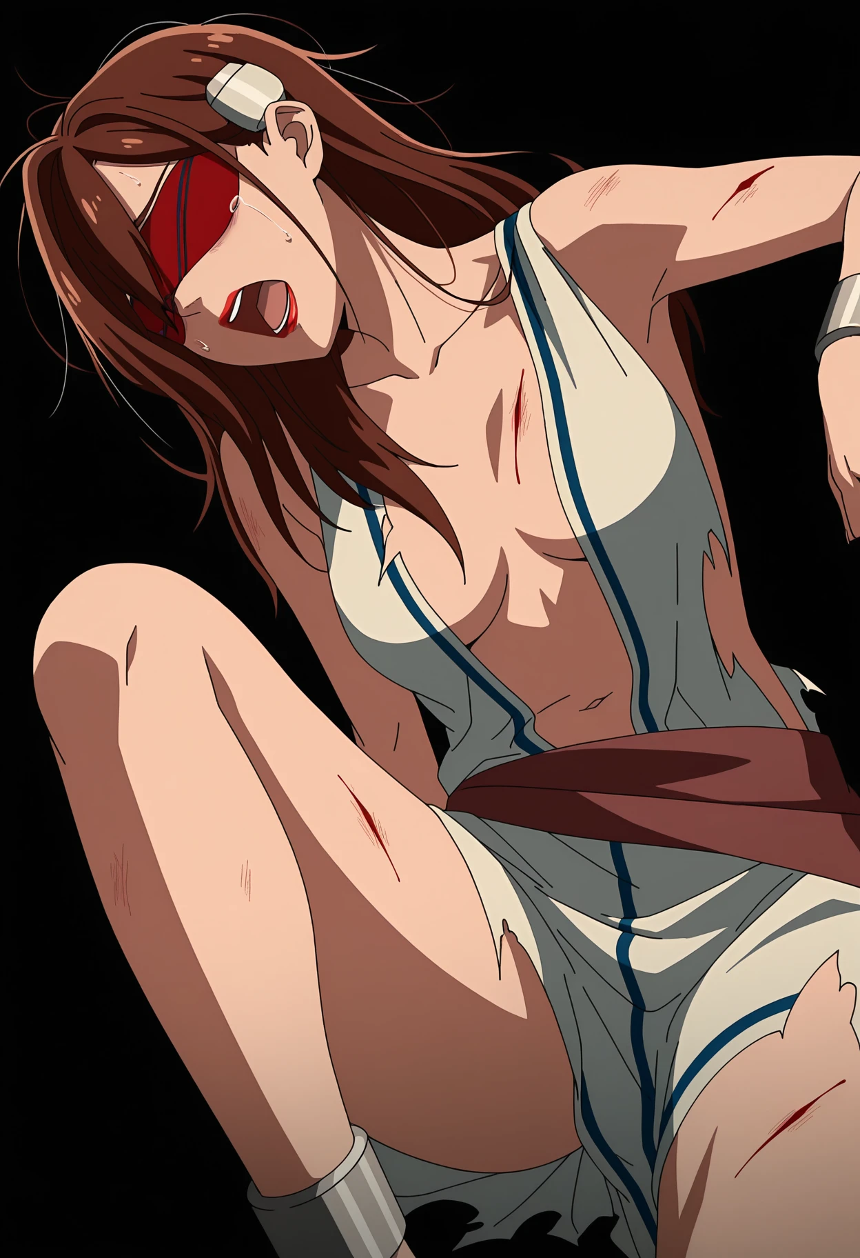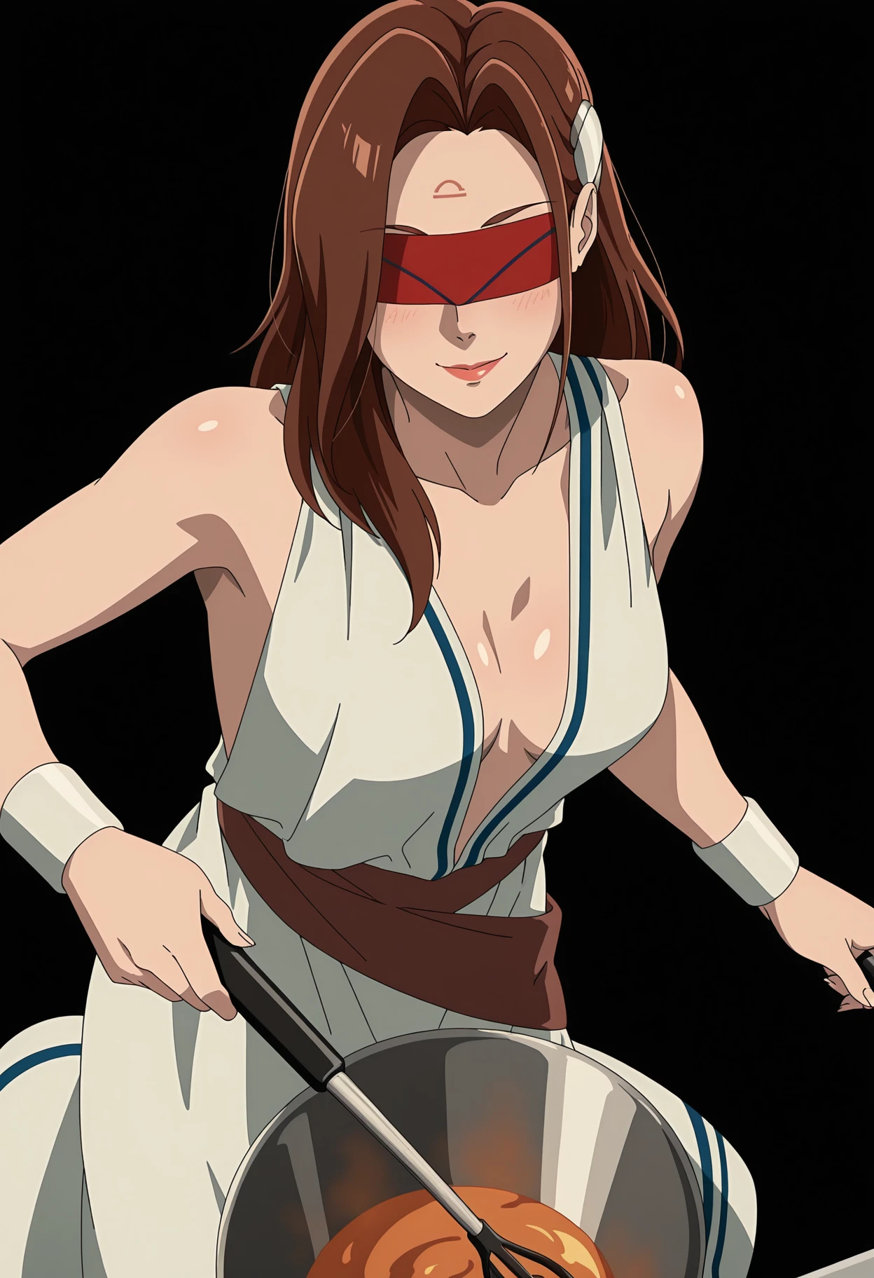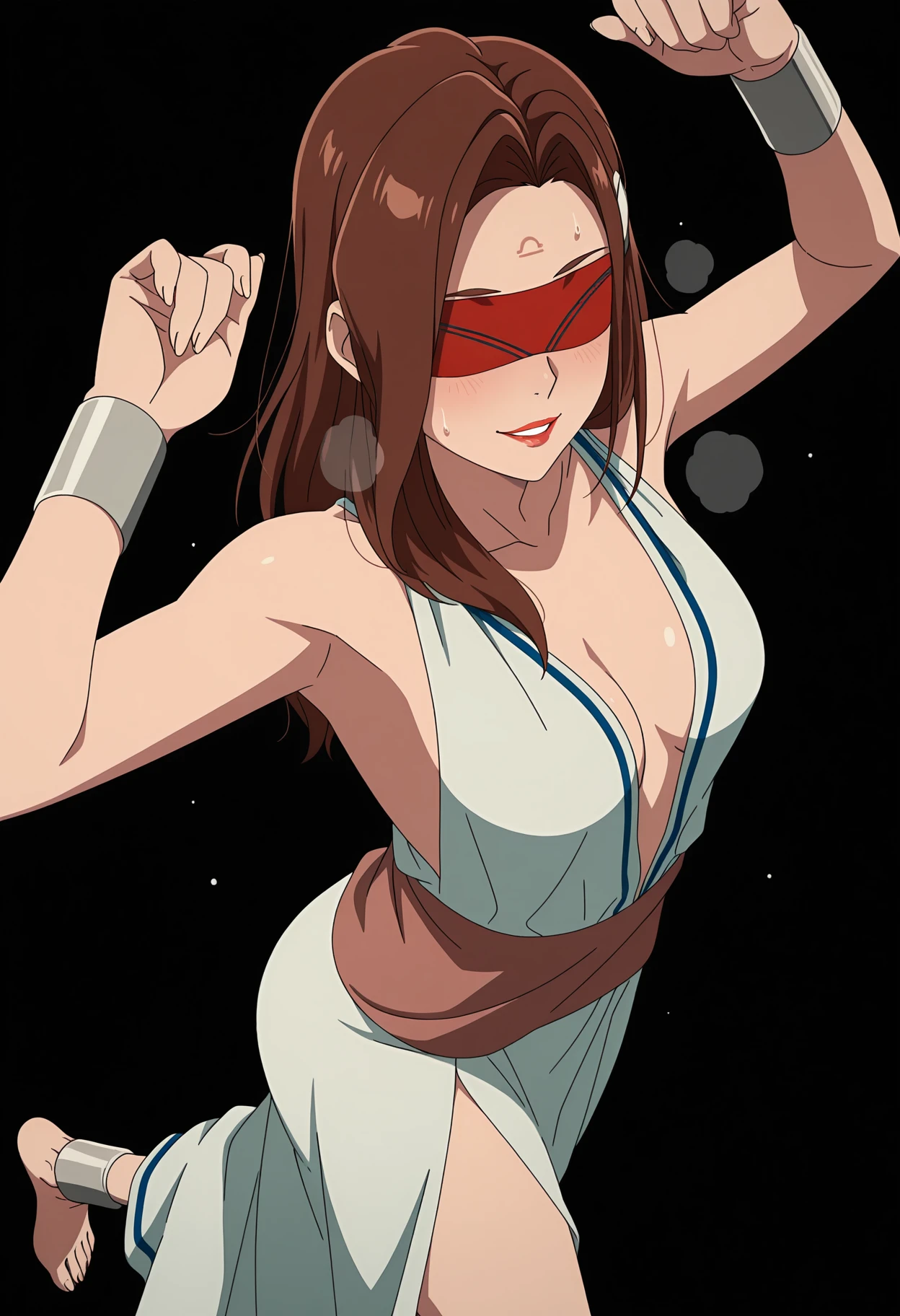 1girl, themis, mature female, long hair, brown hair, covered eyes, blindfold, lips, lipstick, makeup