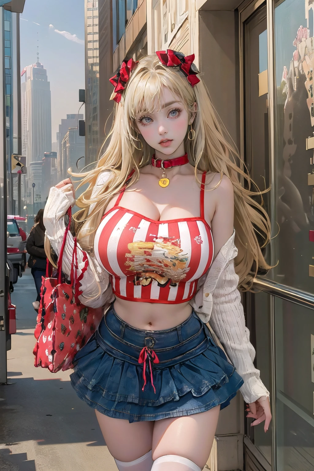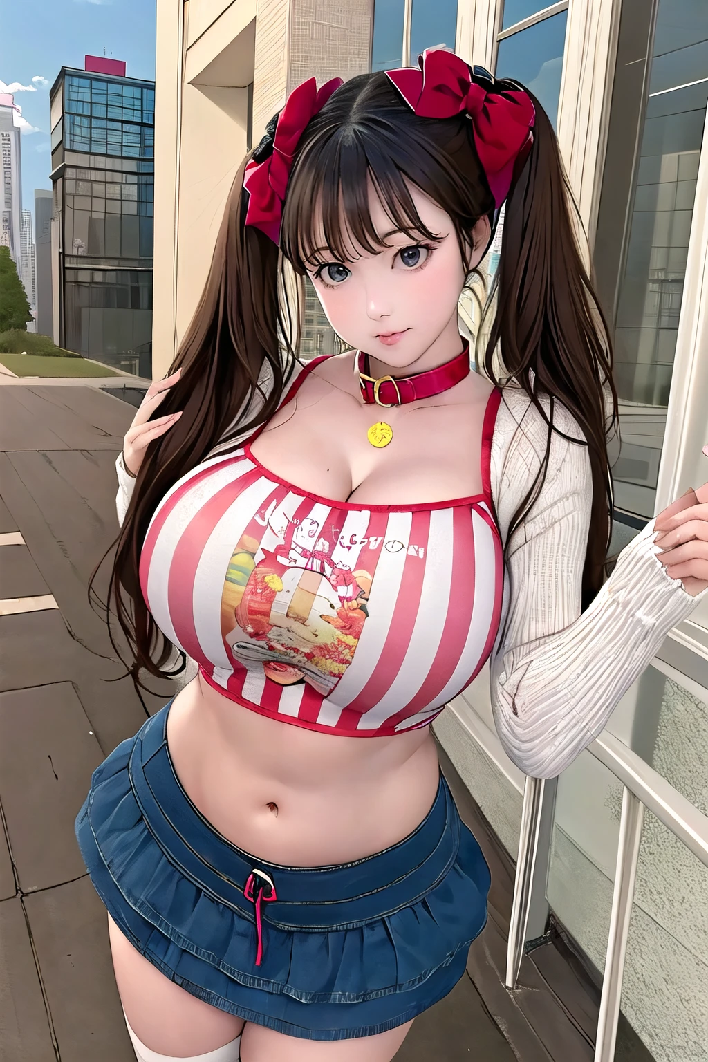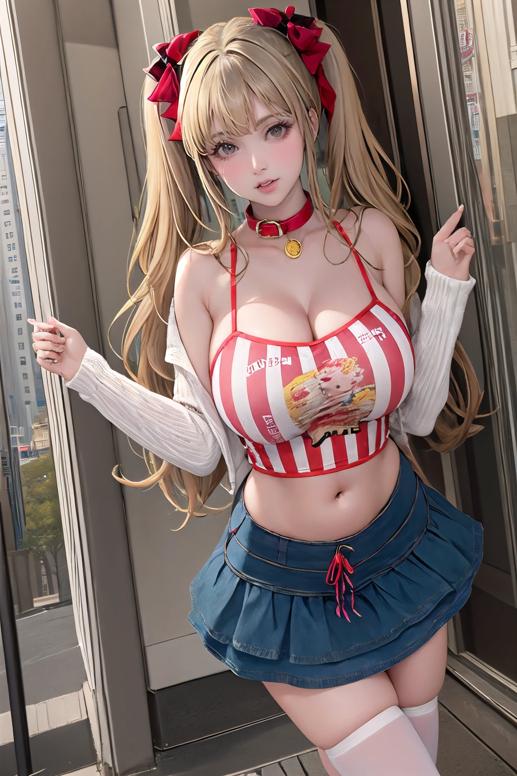 common2,red collar,red bow,denim skirt,blue skirt,white thighhighs,striped shirt,food print,strawberry print,midriff,demin,miniskirt