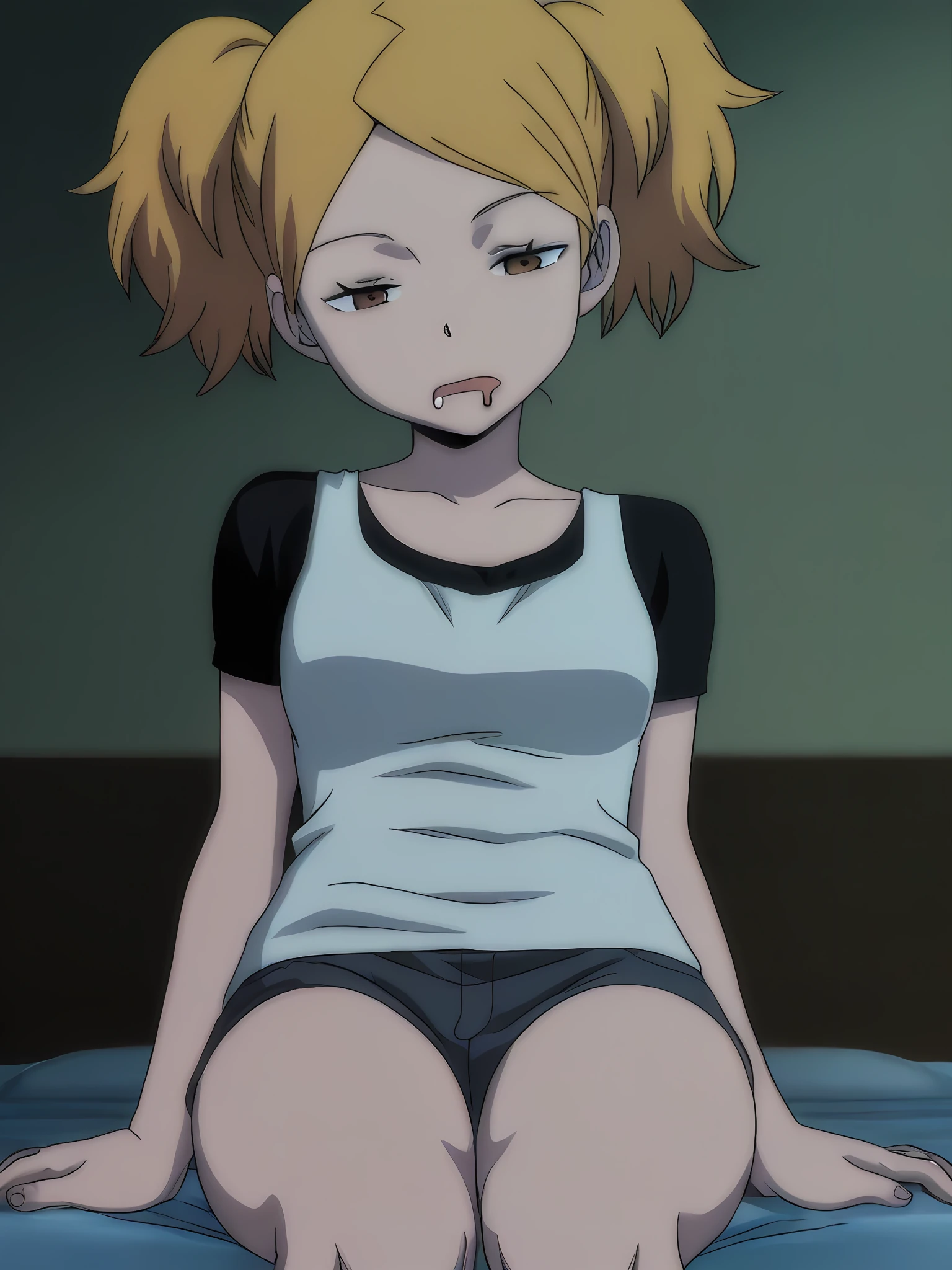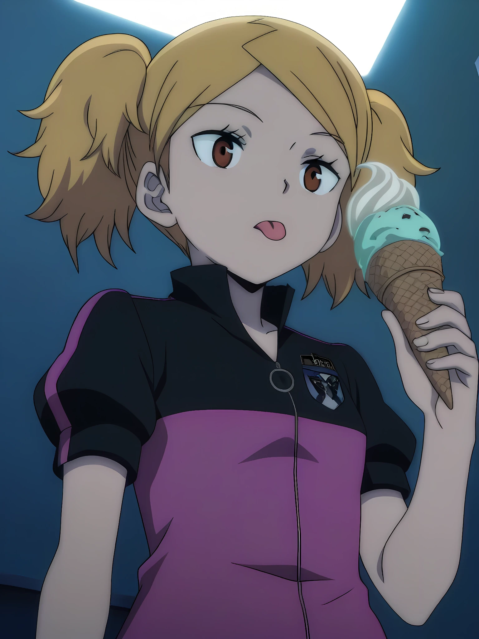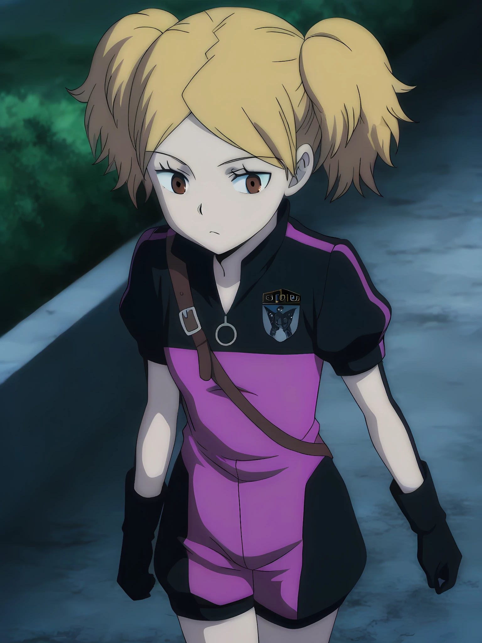 Futaba, 1girl, solo, blonde hair, short sleeves, brown eyes, short twintails, short hair, parted bangs, border uniform