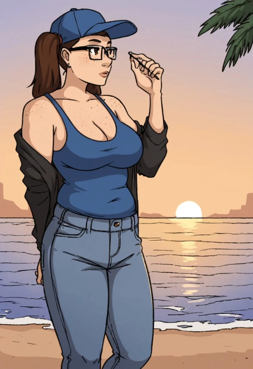 qc, /marigold/, brown hair, twintails, brown eyes, large natural breasts, curvy, thick, chubby, freckles, glasses,