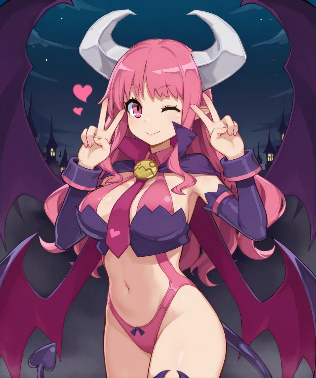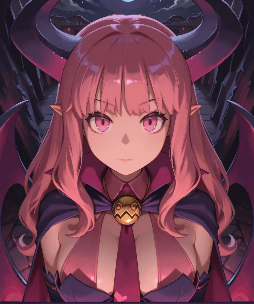 Succubus, long pink hair, pink eyes, demon horns, pointy ears, - demon tail ,