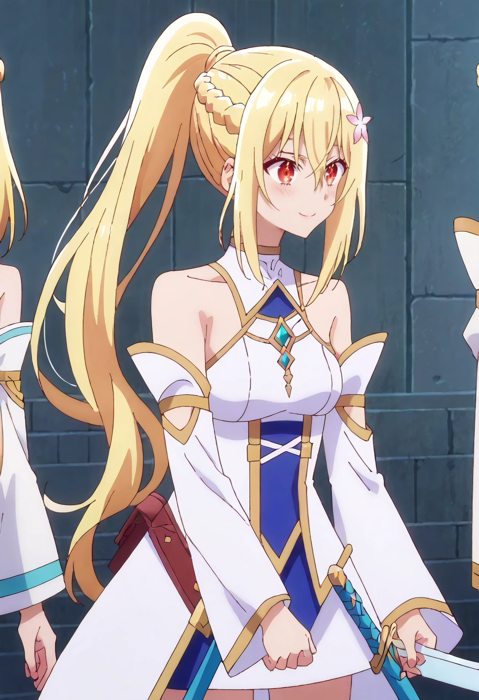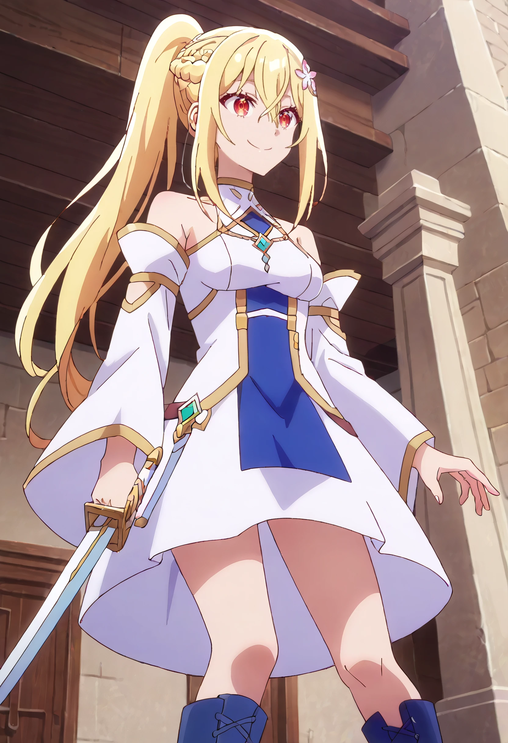 LenaOutfit, braid, ponytail, bare shoulders, detached sleeves, hair ornament, dress, hair flower, flower, white sleeves, white dress, french braid, sidelocks, long sleeves, sword, crown braid, wide sleeves, sheath, half up braid, sheathed, very long hair, boots, blue footwear, off-shoulder dress, knee boots, off shoulder,