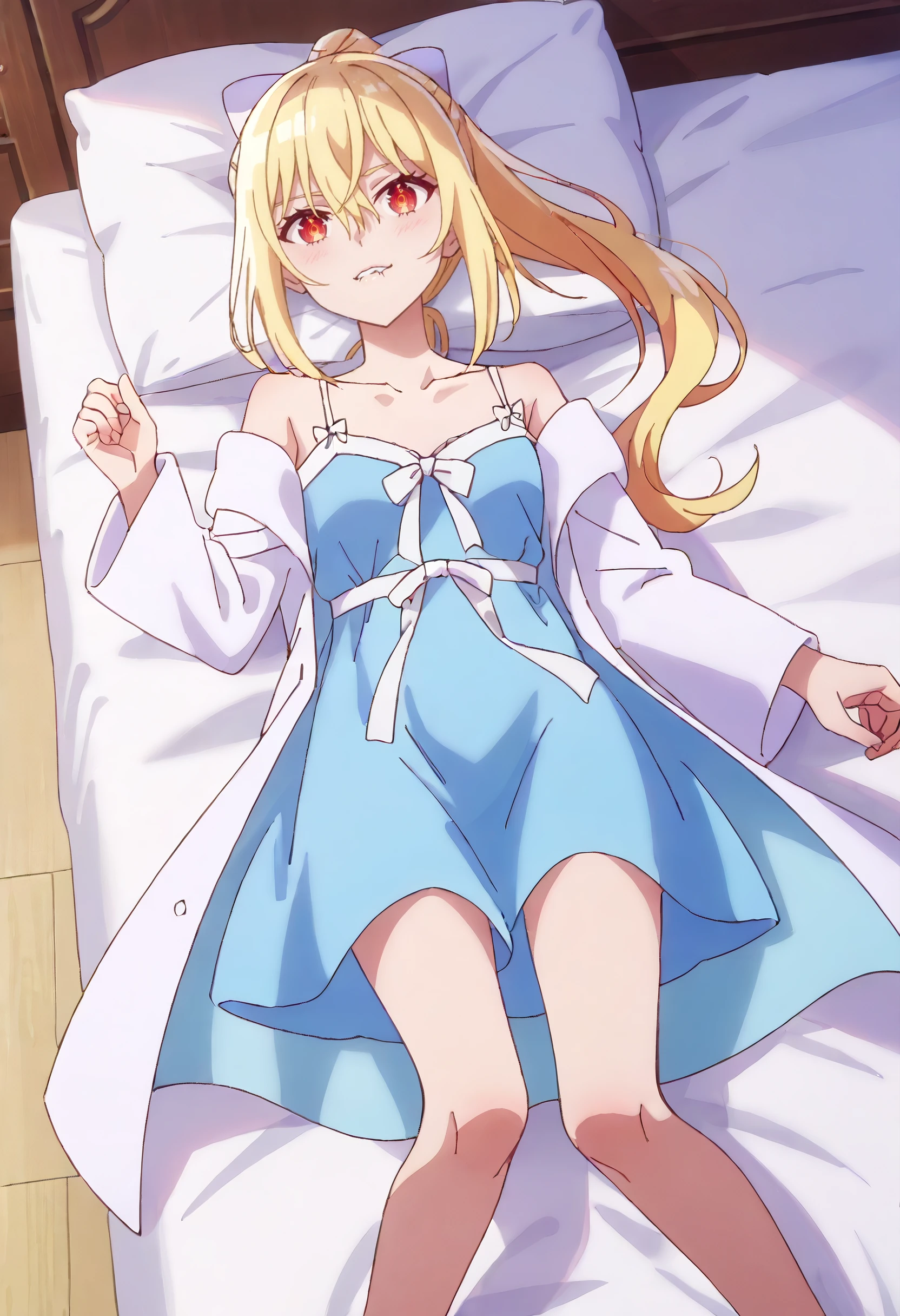LenaCasual, ponytail, long sleeves, dress, sleepwear, nightgown, sidelocks, coat, white nightgown, off shoulder, barefoot, bathrobe, white ribbon, pajamas, bare legs, white bow, white capelet, crossed bangs, blue dress,