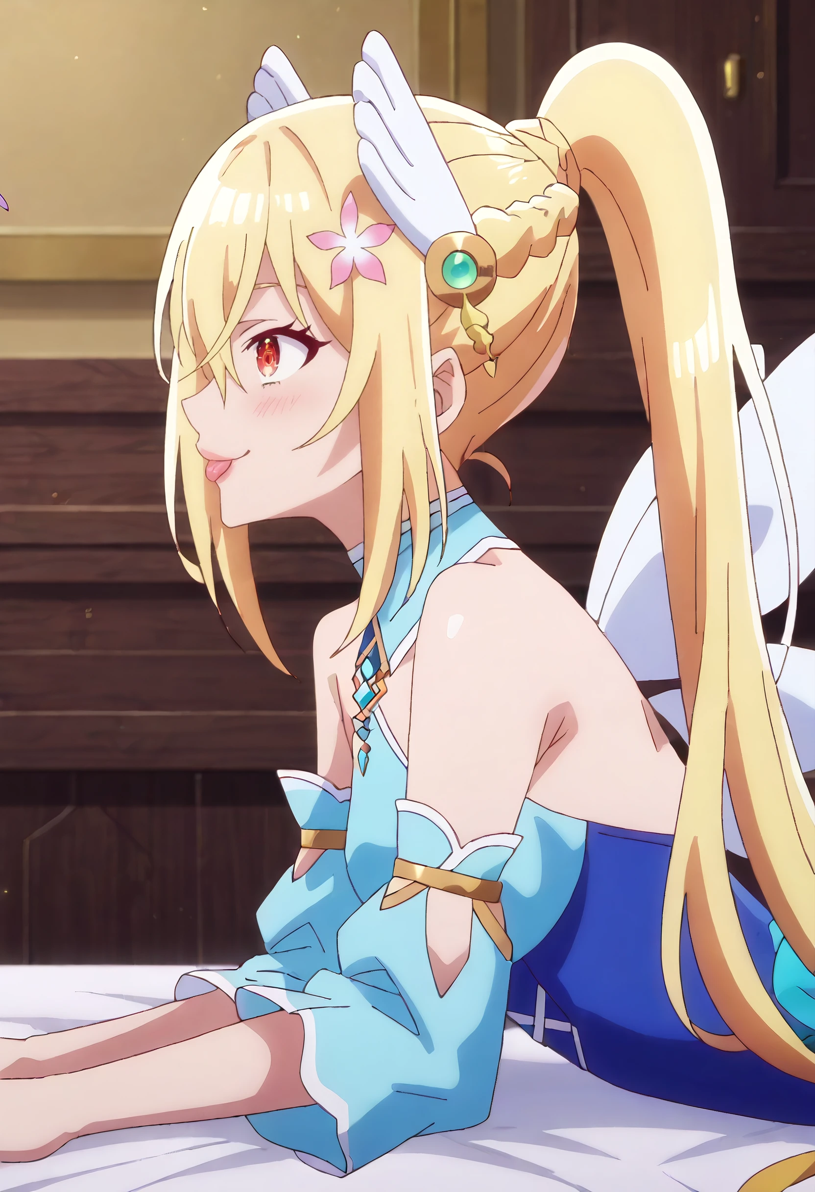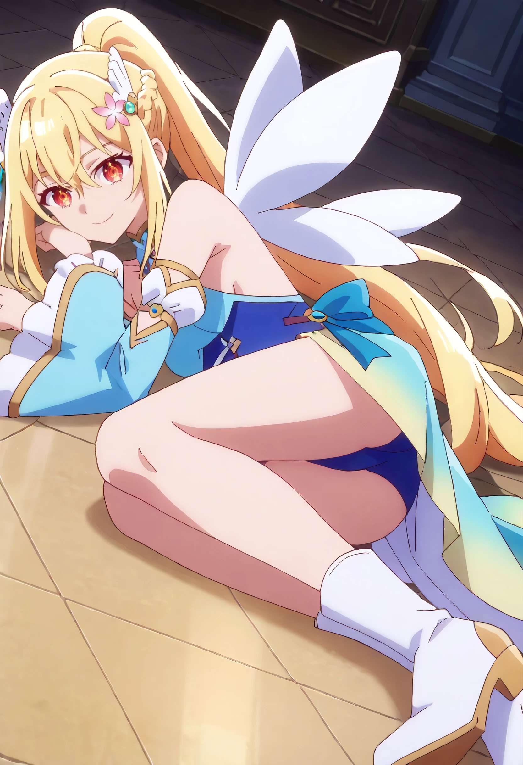 LenaDress, hair ornament, bare shoulders, ponytail, detached sleeves, wing hair ornament, dress, blue dress, wings, leotard, braid, flower, sidelocks, blue leotard, very long hair, blue sleeves, hair flower, showgirl skirt, puffy detached sleeves, crown braid, white footwear, fairy wings, boots, white wings,