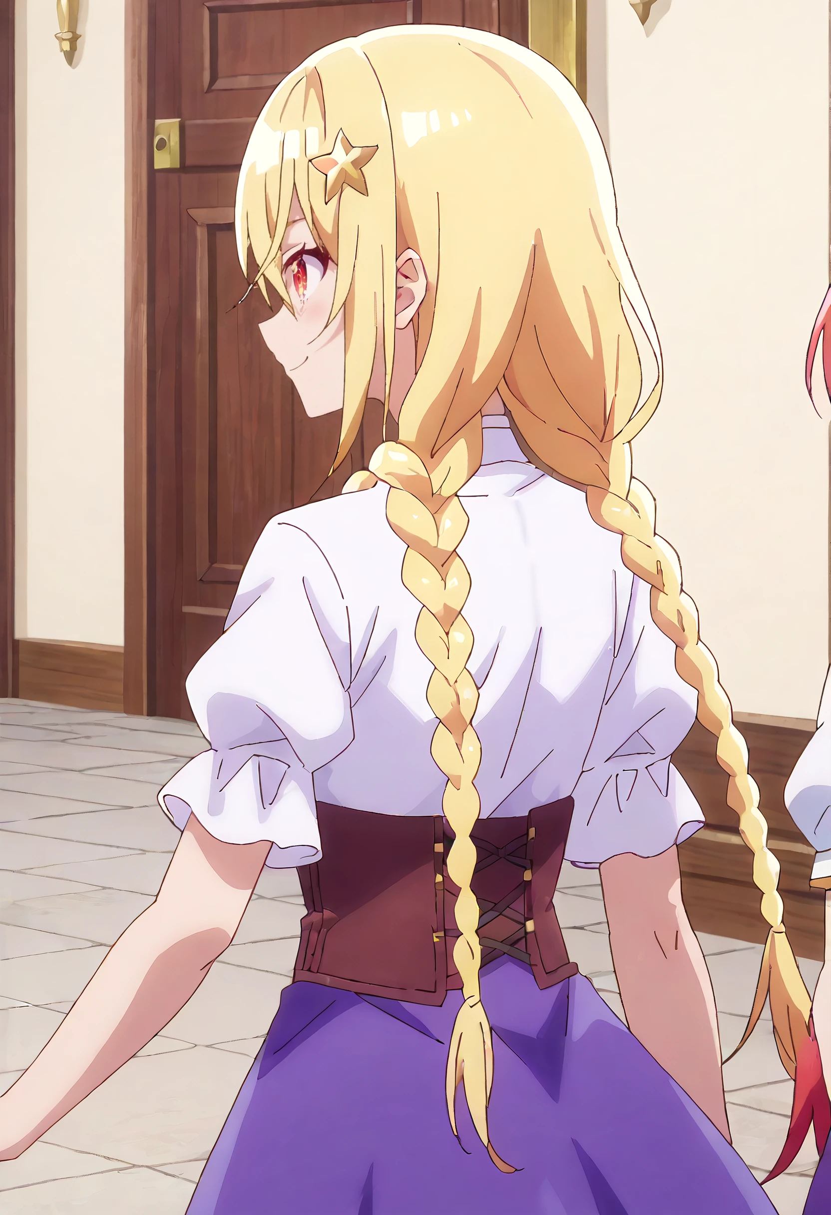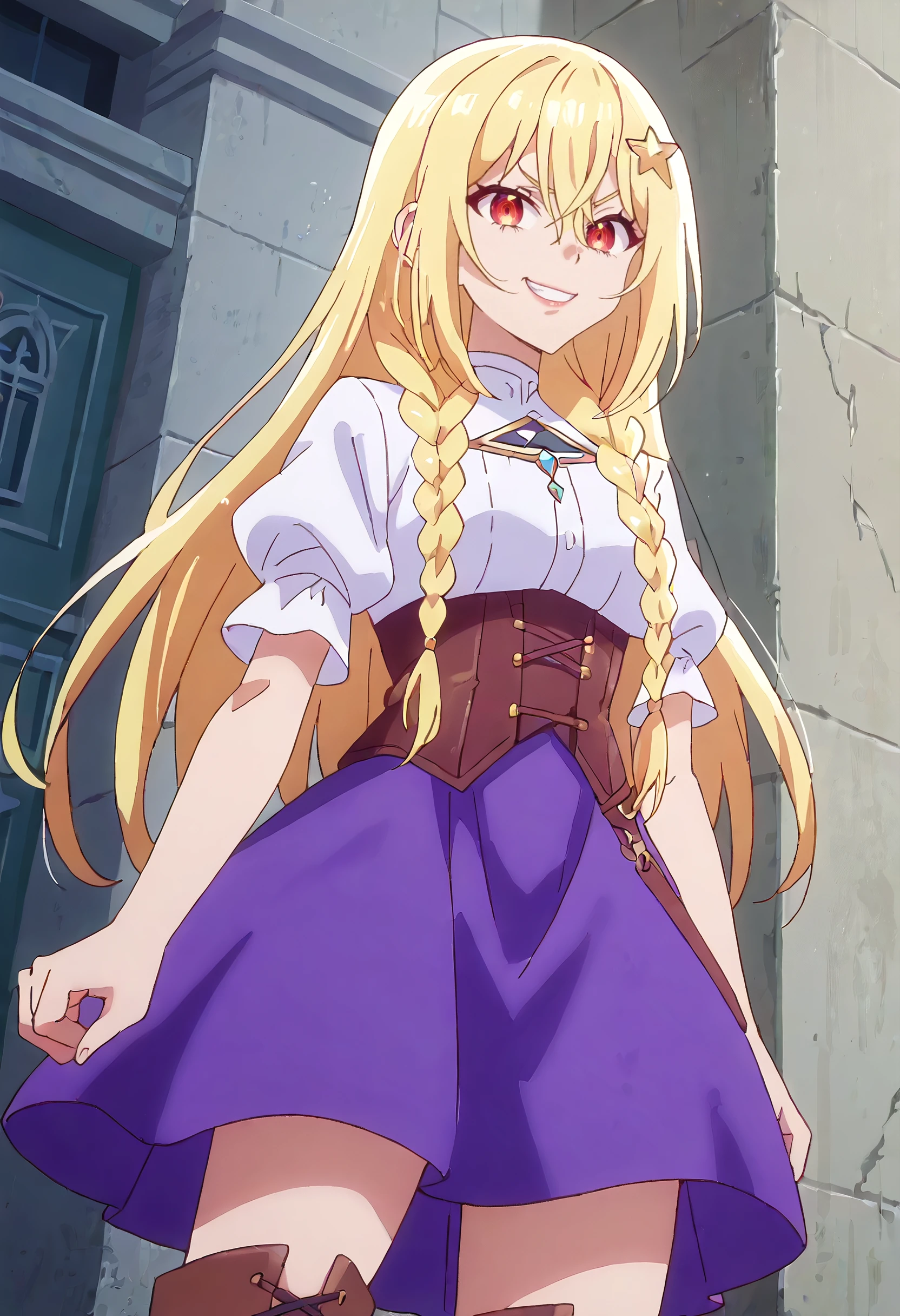 LenaShirt, short sleeves, hair ornament, shirt, white shirt, puffy sleeves, skirt, puffy short sleeves, braid, twin braids, purple skirt, corset, underbust, star hair ornament, side braids, black corset, brown footwear, boots,