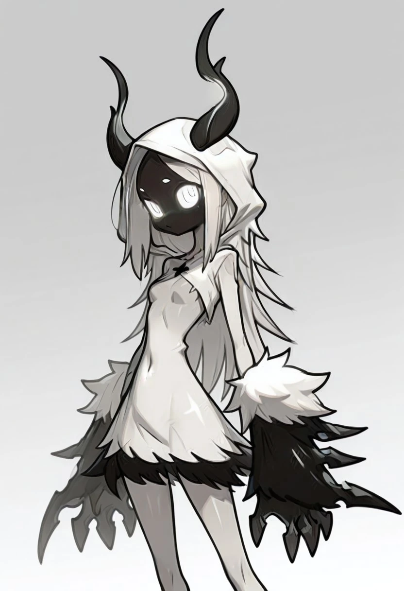 Demon, White hair, white eyes, black pupils, dark skin, black skin, shadow skin, long hair, long horns, black horns